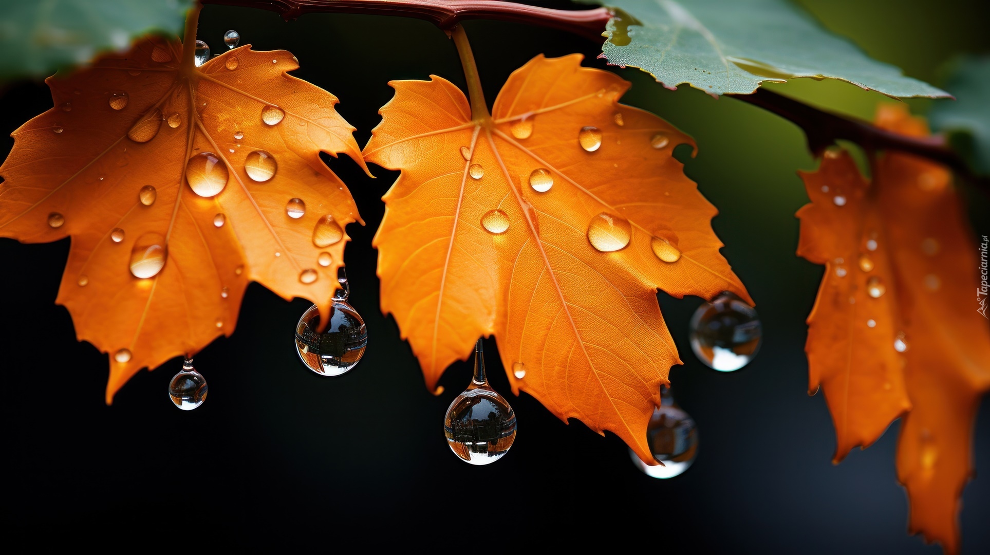 Edytor tapety: Krople na pożółkłych liściach w grafice