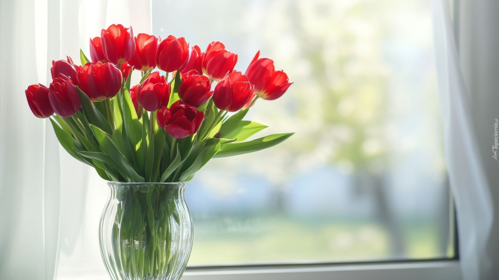 Edytor tapety: Czerwone tulipany w szklanym wazonie przy oknie