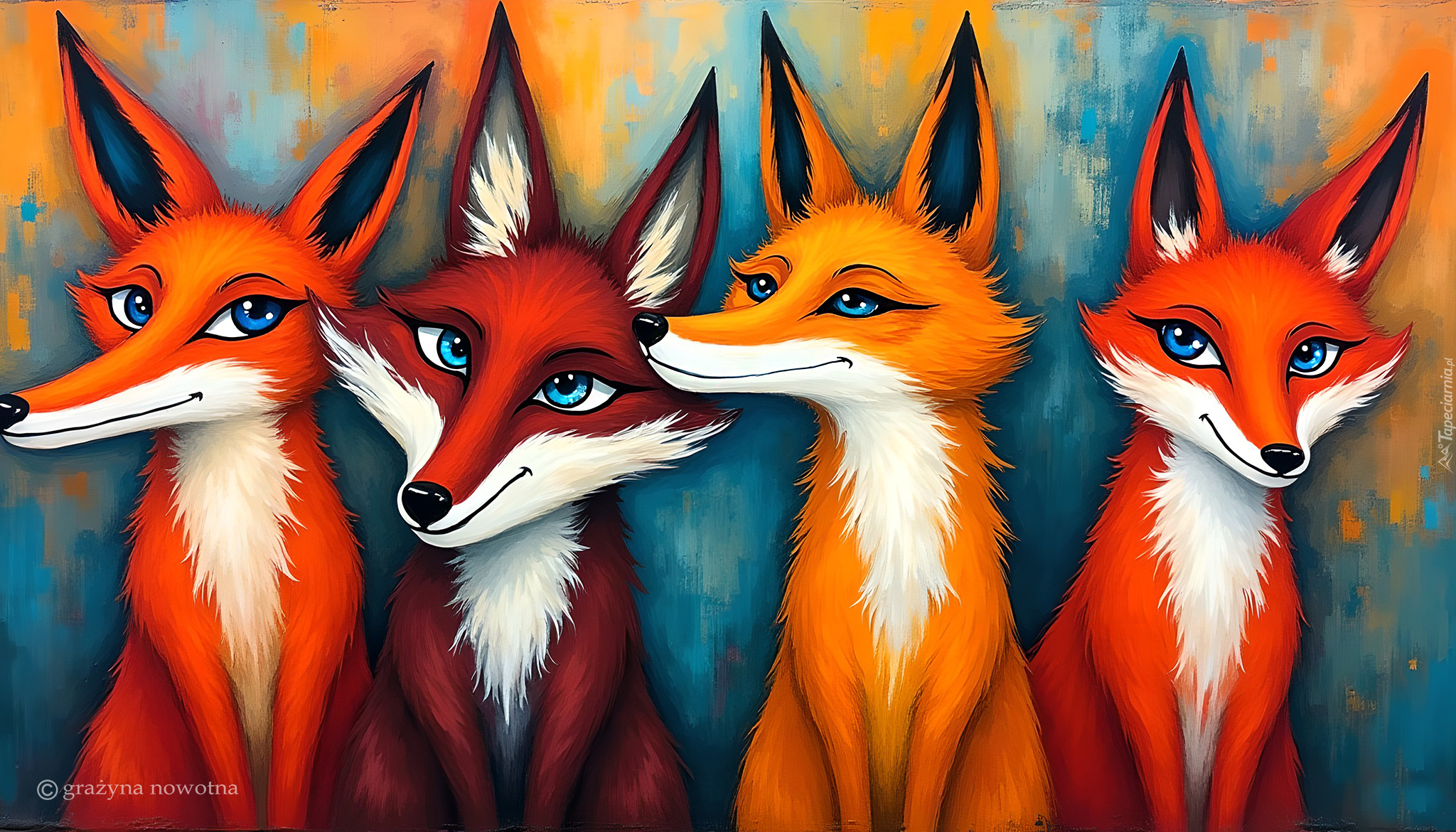 Edytor tapety: Cztery uśmiechnięte lisy w grafice
