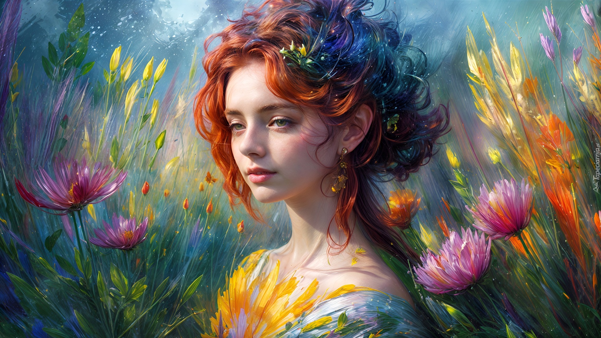 Edytor tapety: Rudowłosa kobieta wśród kwiatów w grafice