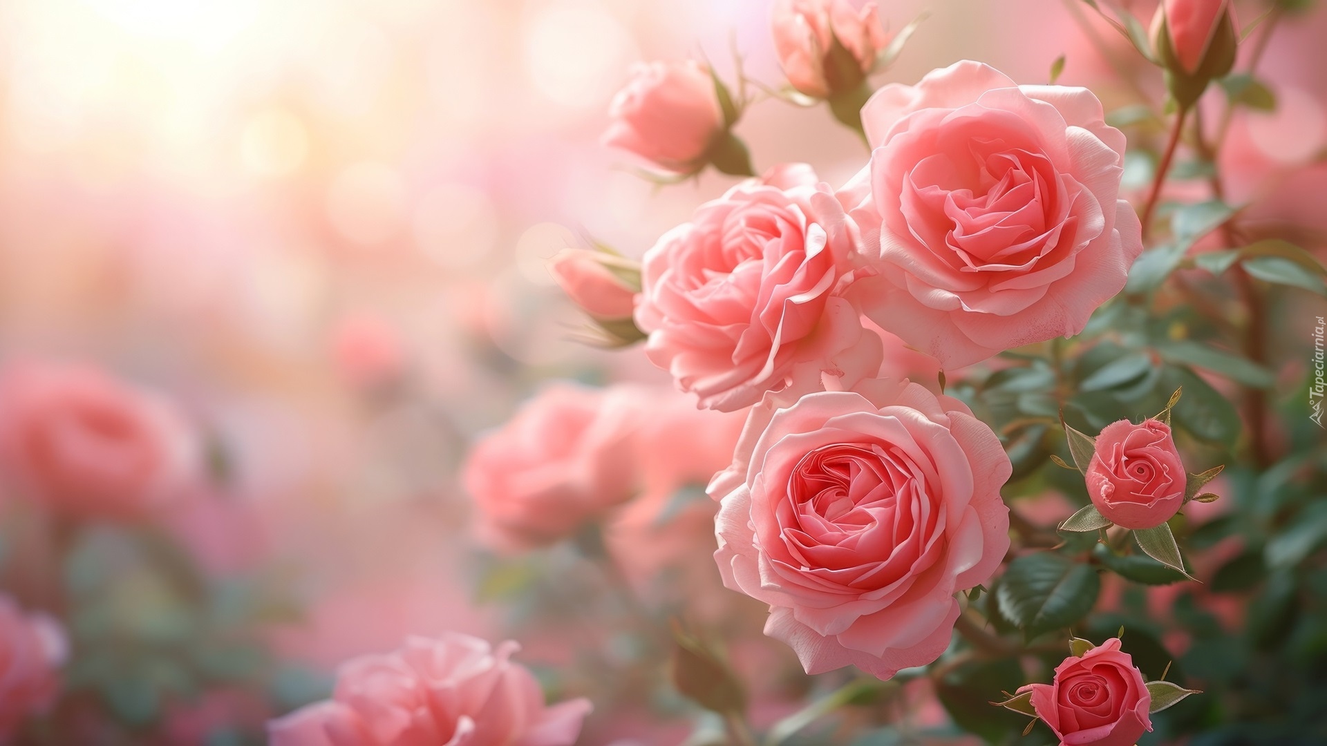 Edytor tapety: Rozświetlone światłem różowe róże na krzewie
