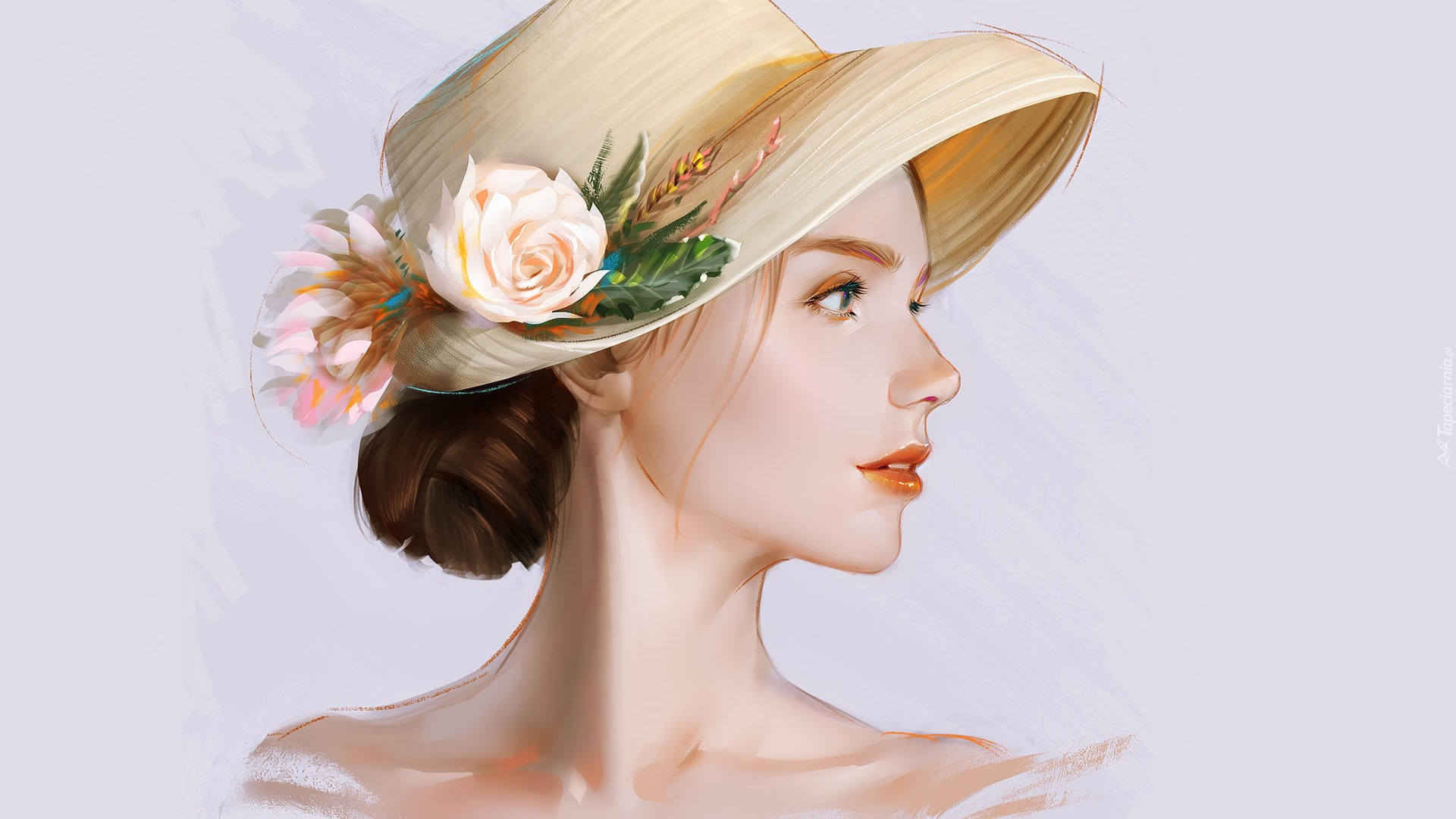 Edytor tapety: Profil kobiety w kapeluszu z kwiatami