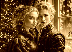 Edytor tapety: Kobieta i mężczyzna stojący przy oknie z oświetloną choinką w tle