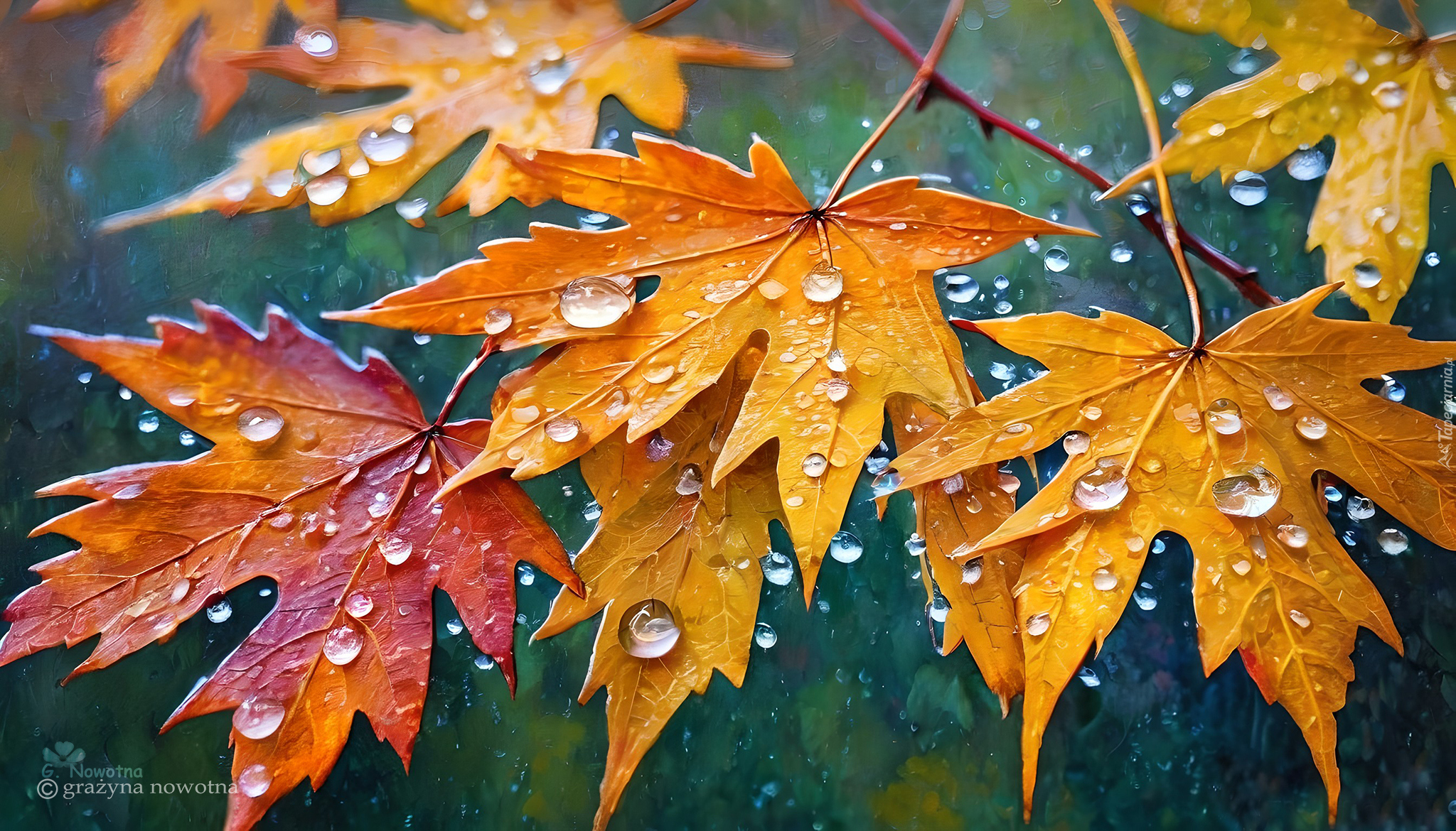 Edytor tapety: Krople wody na pożółkłych jesiennych liściach
