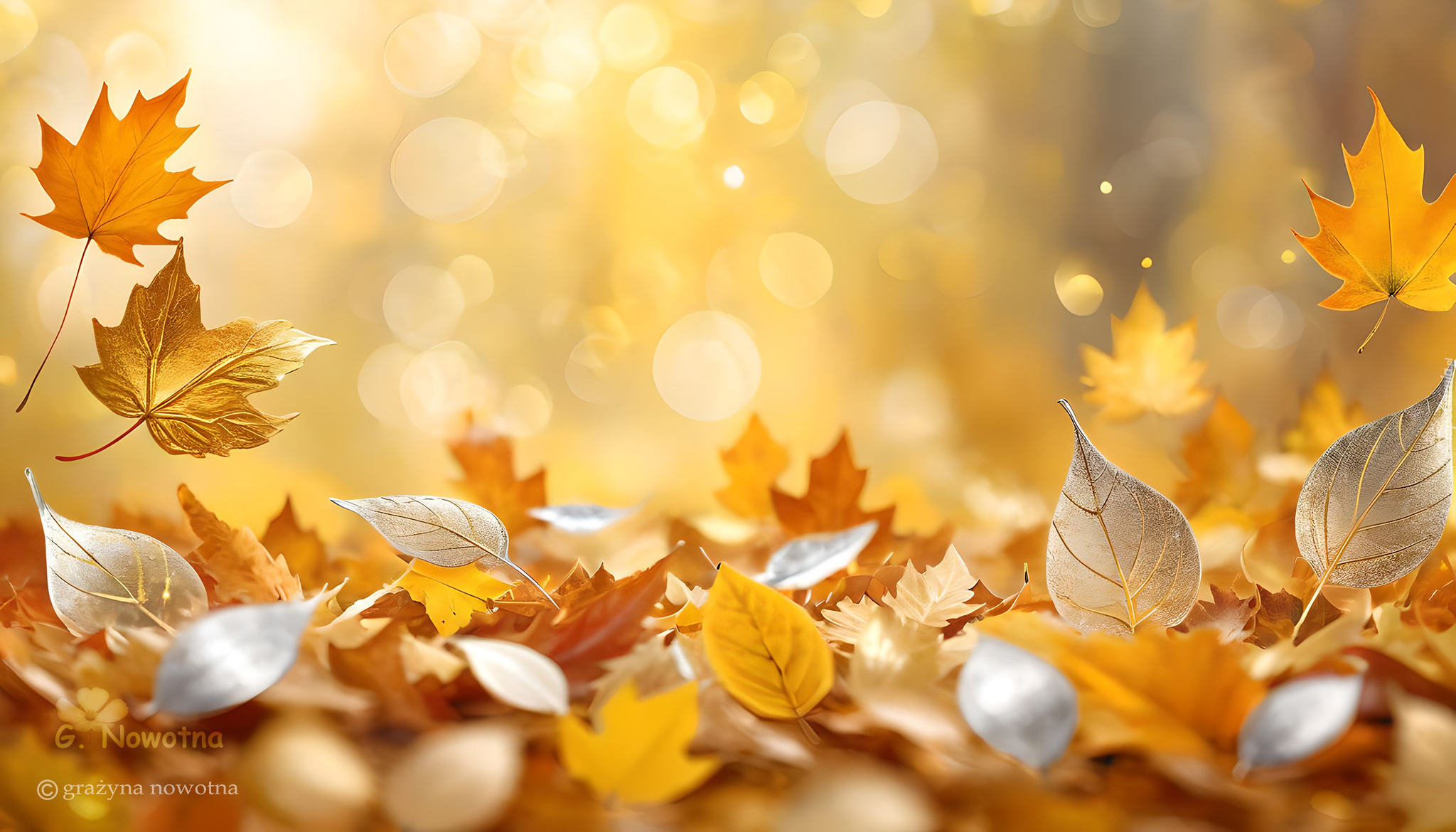 Edytor tapety: Rozświetlone złote i srebrne jesienne liście w grafice
