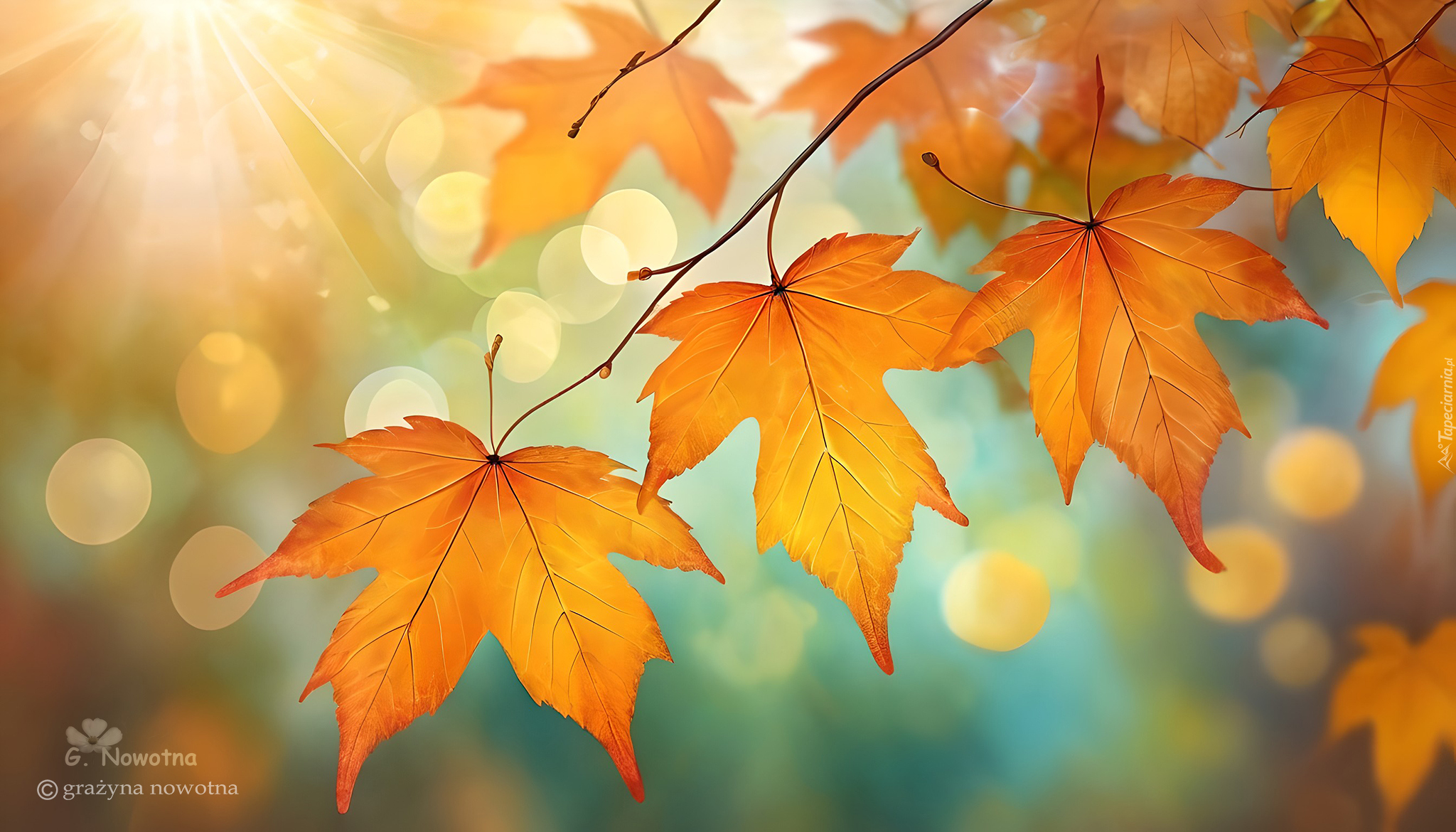 Edytor tapety: Rozświetlone promieniami słońca pożółkłe liście na gałązce