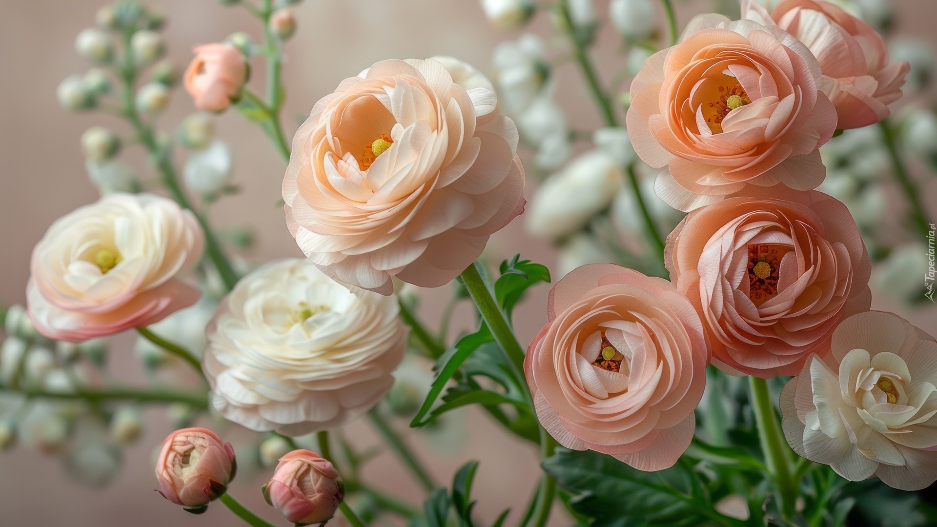 Edytor tapety: Rozwinięte białe i różowe kwiaty z pąkami obok
