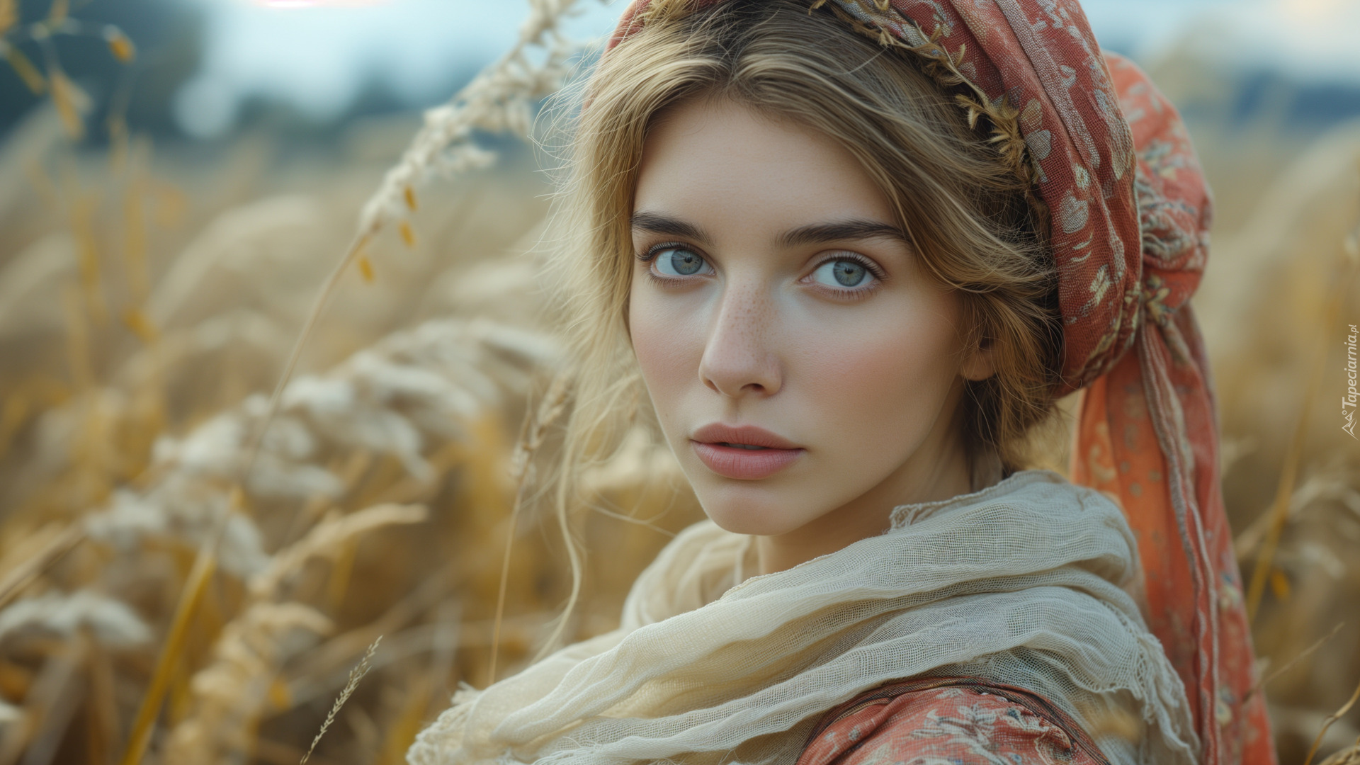 Edytor tapety: Spojrzenie kobiety w chuście na głowie wśród roślin