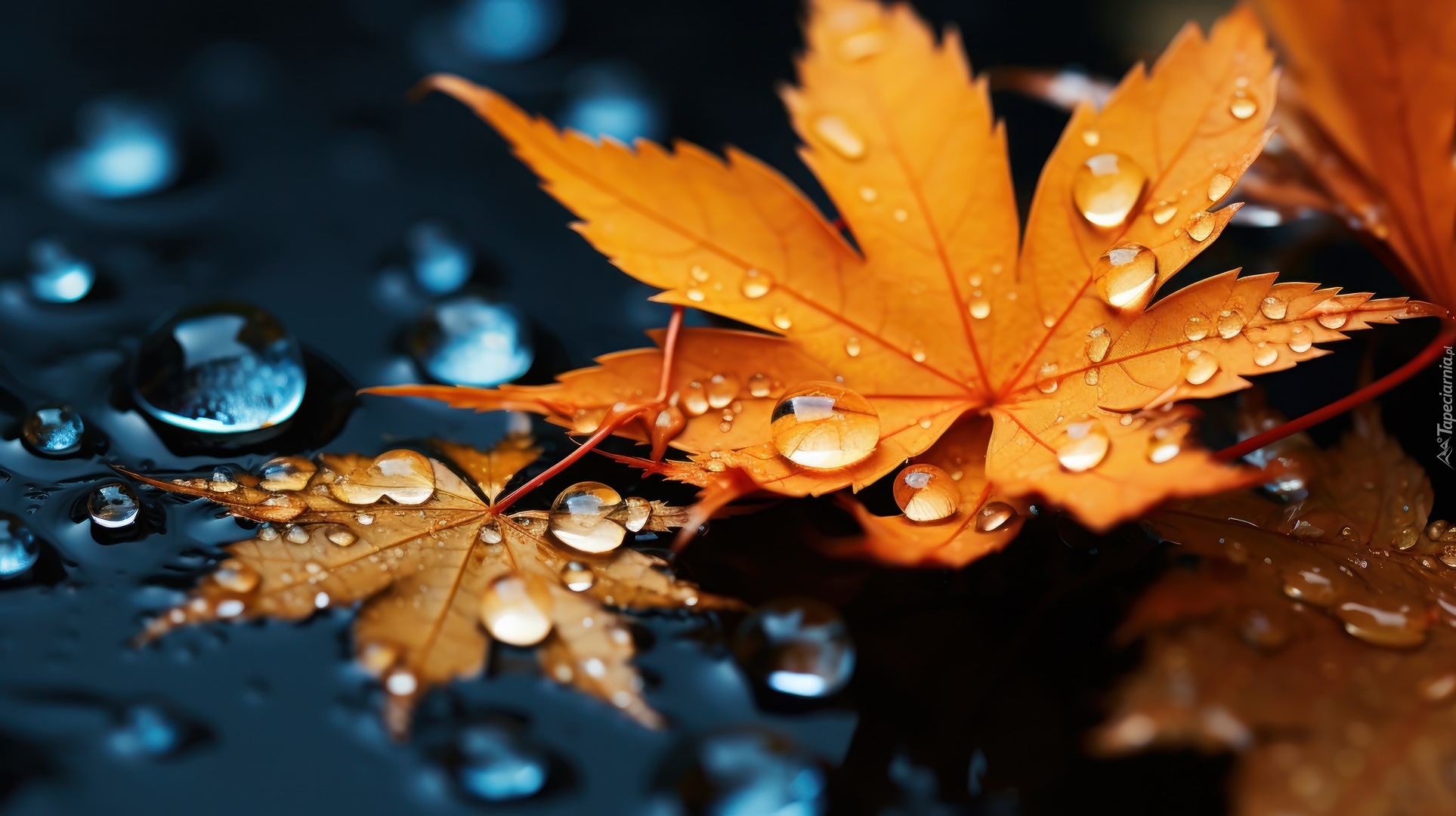 Edytor tapety: Krople na pożółkłych liściach klonu w wodzie
