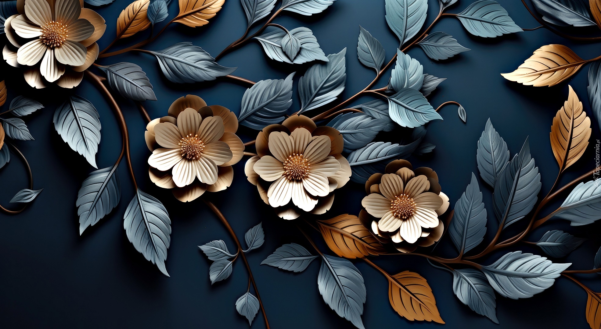 Edytor tapety: Złote kwiaty i szare liście na ciemnym tle