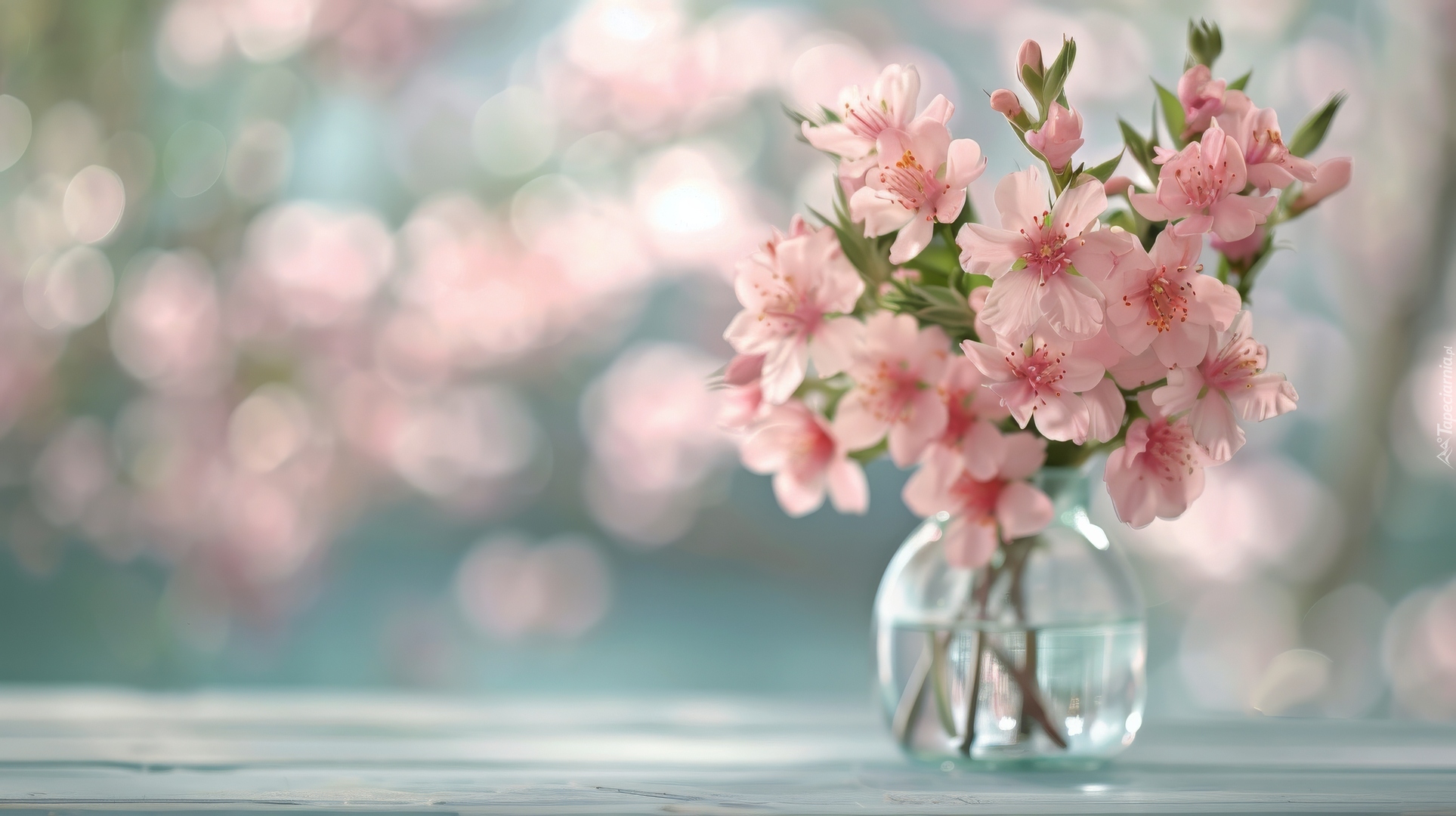 Edytor tapety: Różowe kwiaty w szklanym wazonie