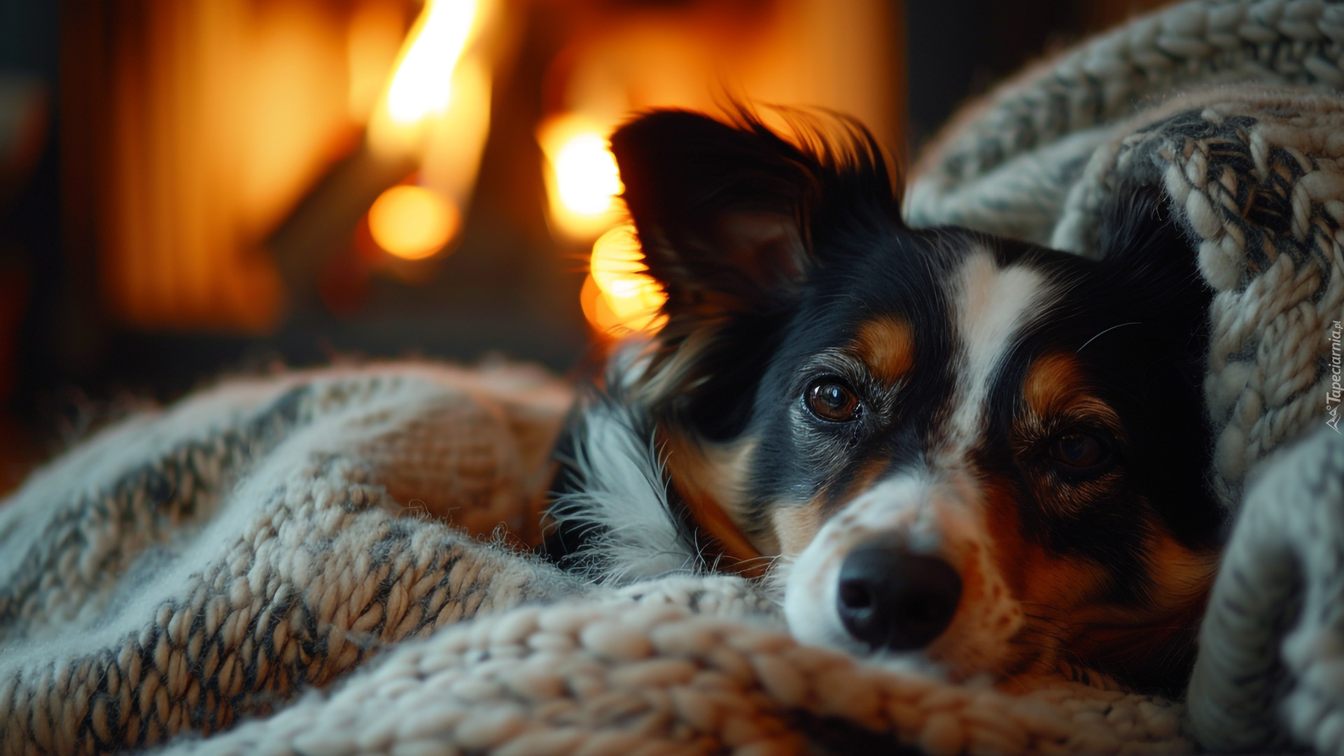 Edytor tapety: Pies leżący pod kocem na tle kominka