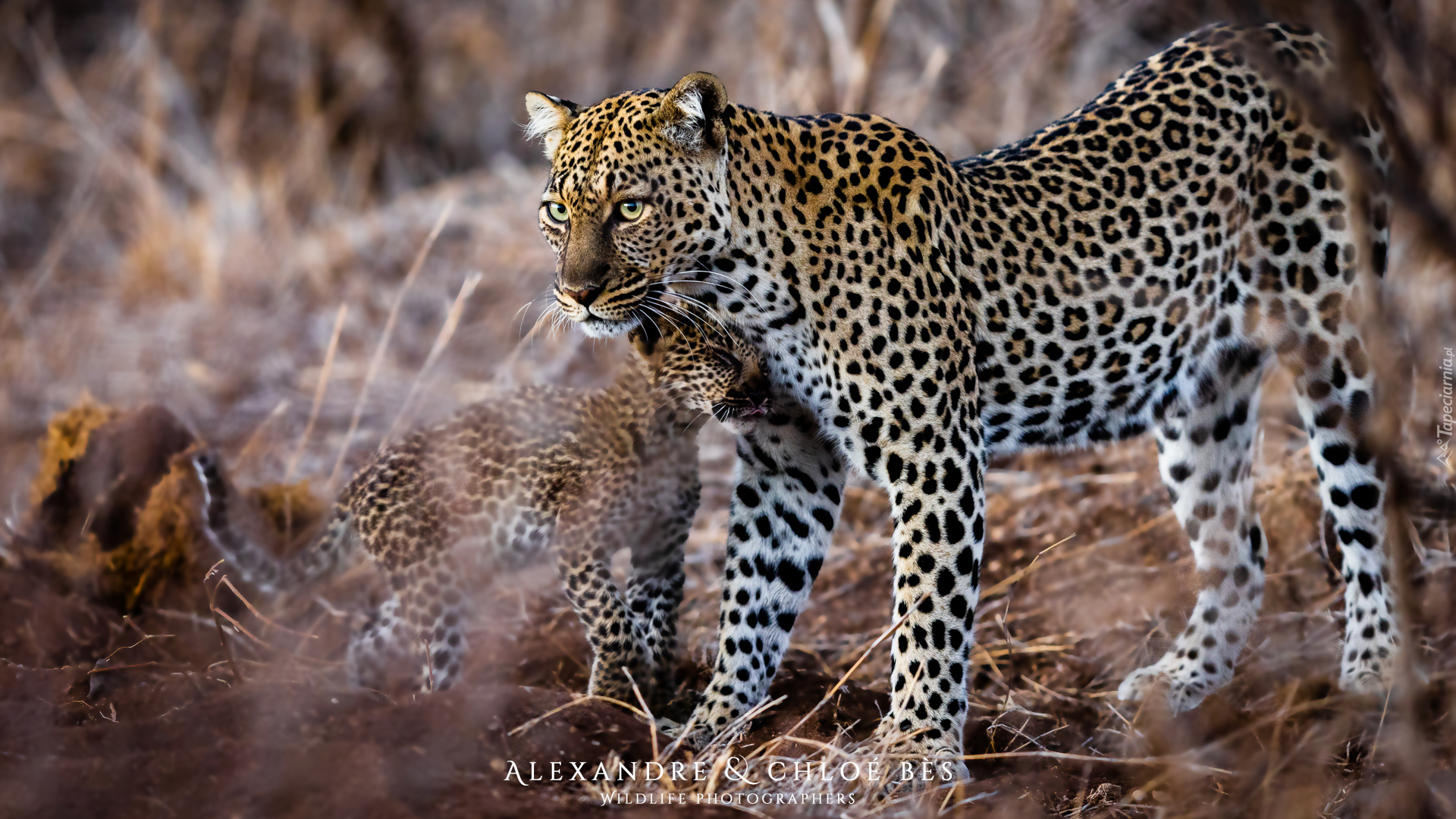 Edytor tapety: Duży i mały lampart wśród roślin