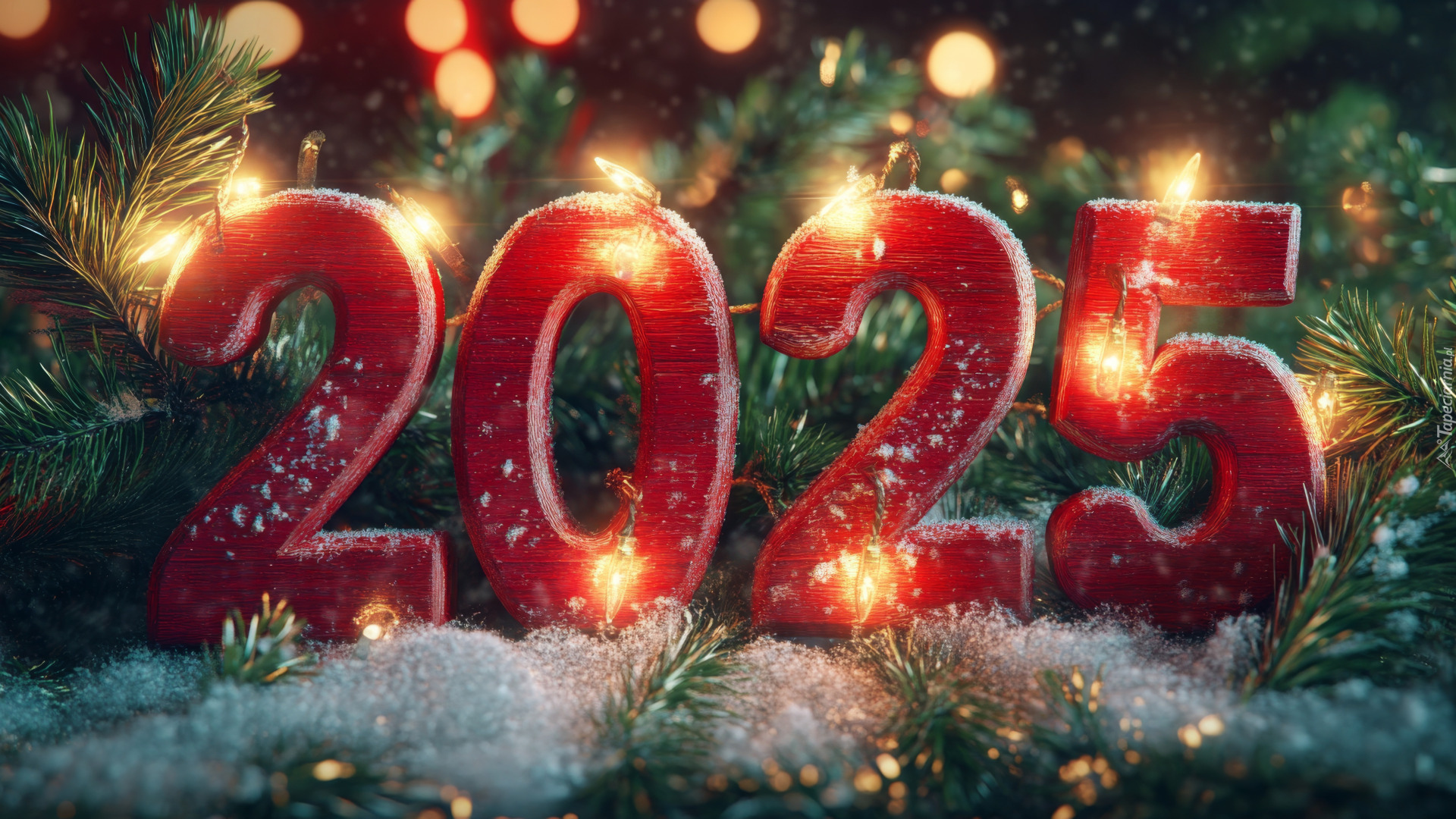 Edytor tapety: Data 2025 i światełka na świerkowych gałązkach