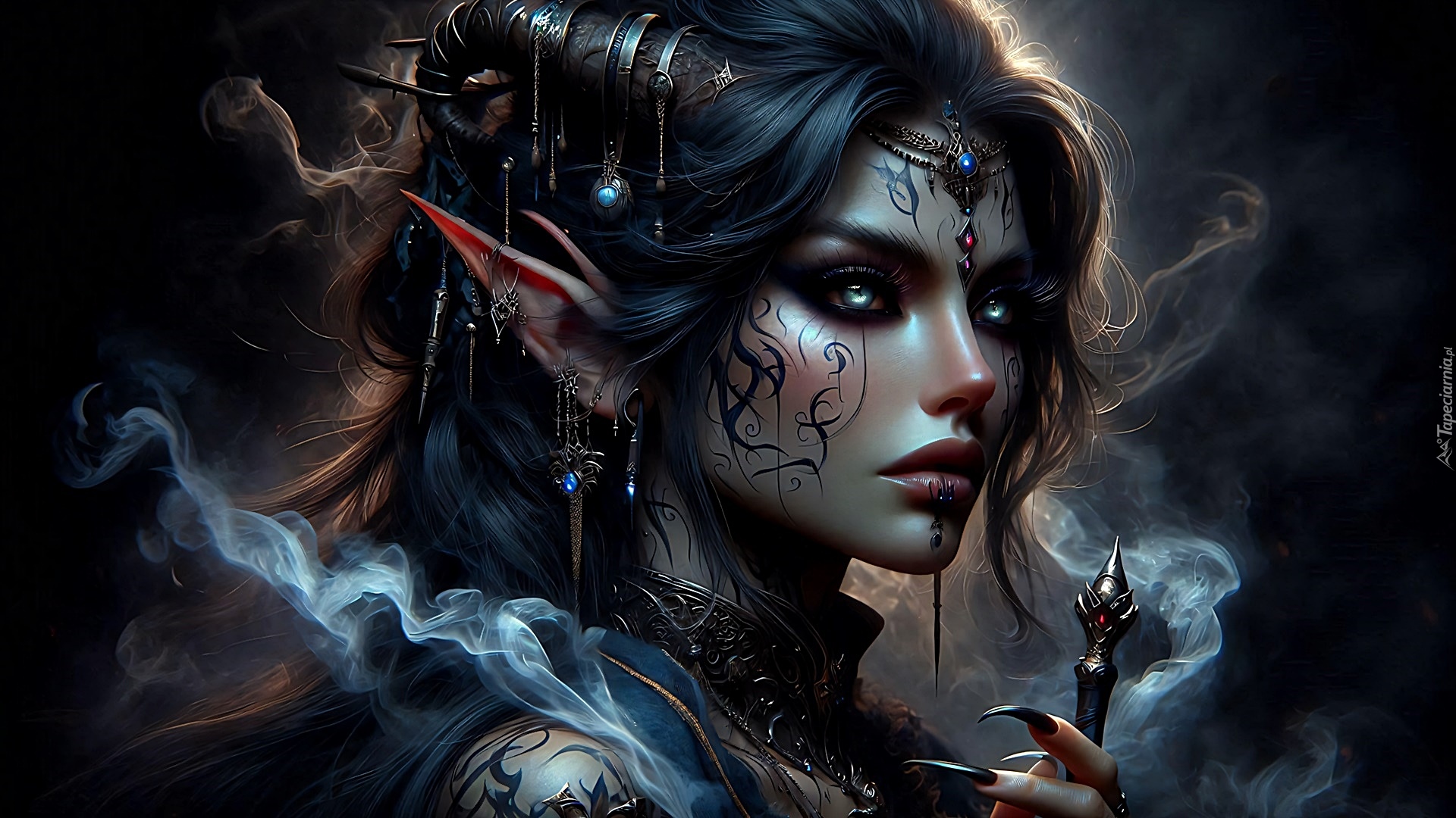 Edytor tapety: Elfka z biżuterią i tatuażem w grafice fantasy