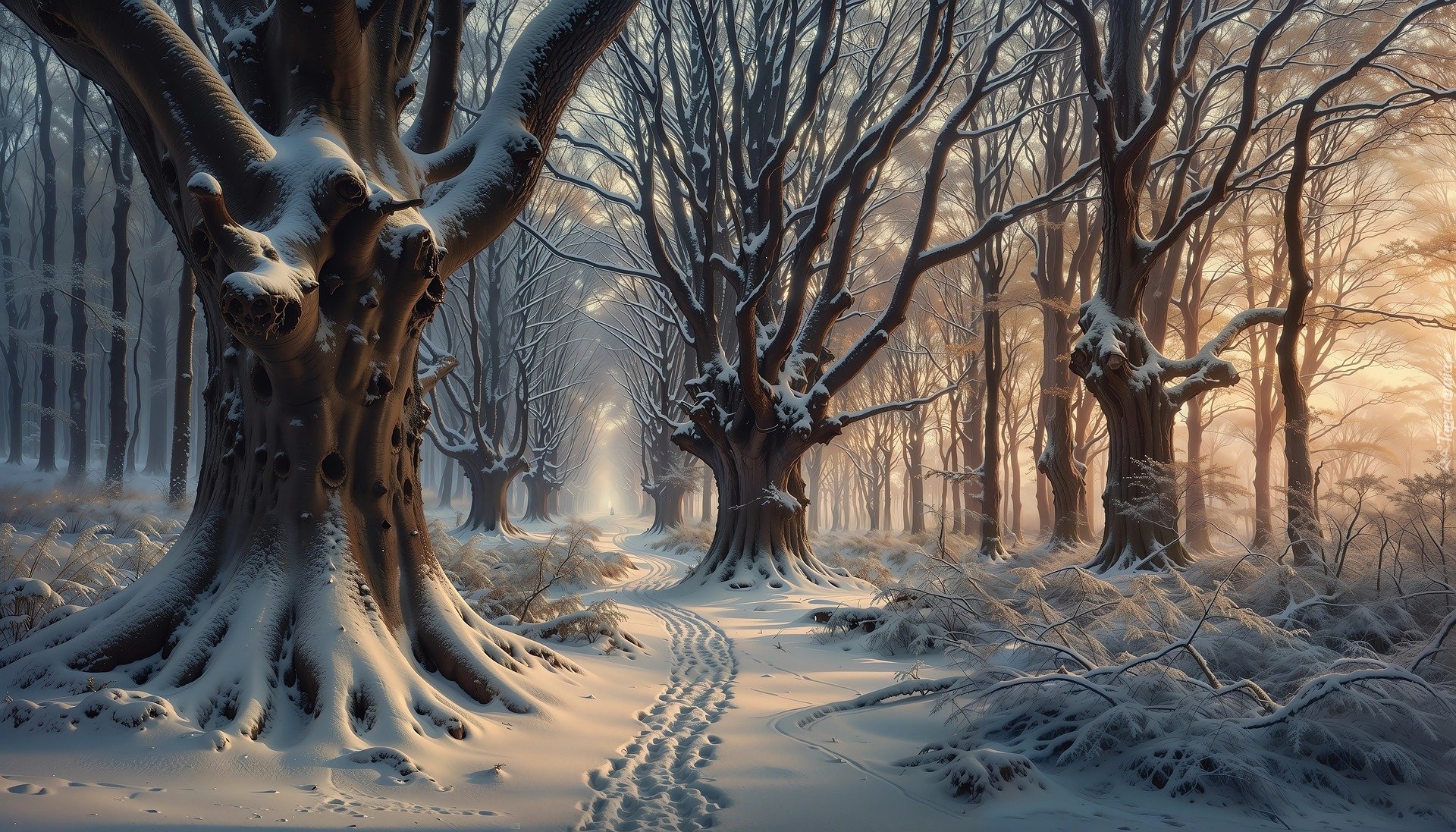 Edytor tapety: Ślady na śniegu między drzewami w zimowym lesie