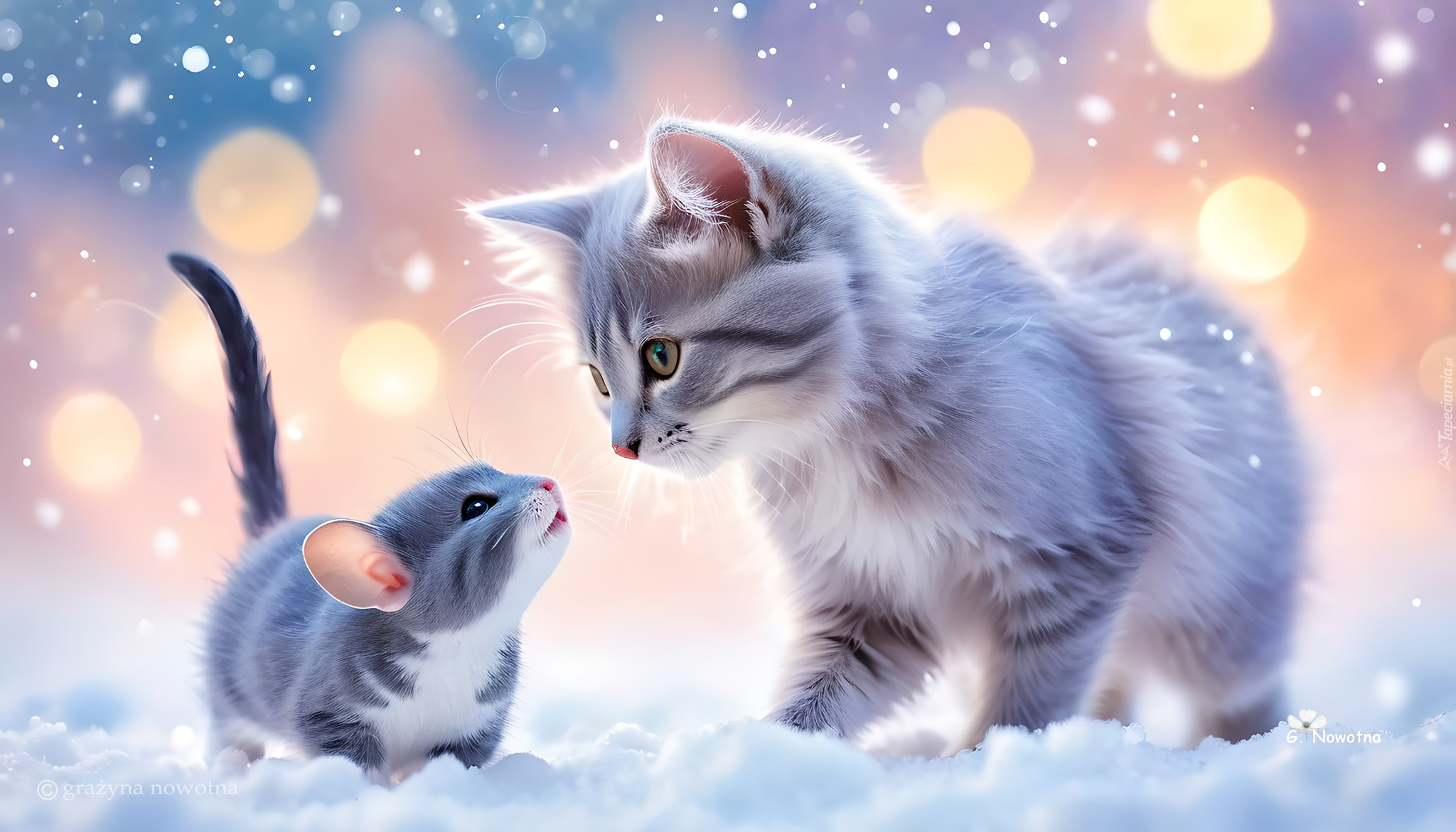 Edytor tapety: Kot i mysz na śniegu w grafice