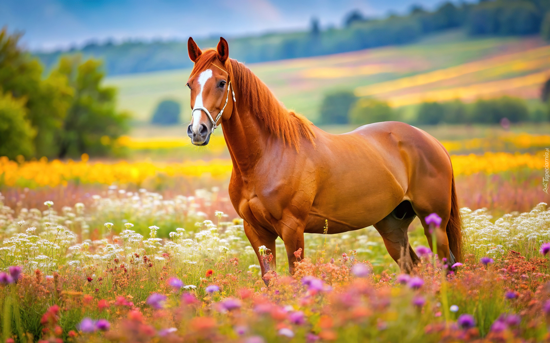 Edytor tapety: Brązowy koń na ukwieconej łące