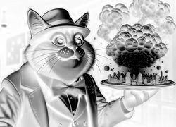 Edytor tapety: Kot w kapeluszu i wybuch bomby między domami w grafice fantasy