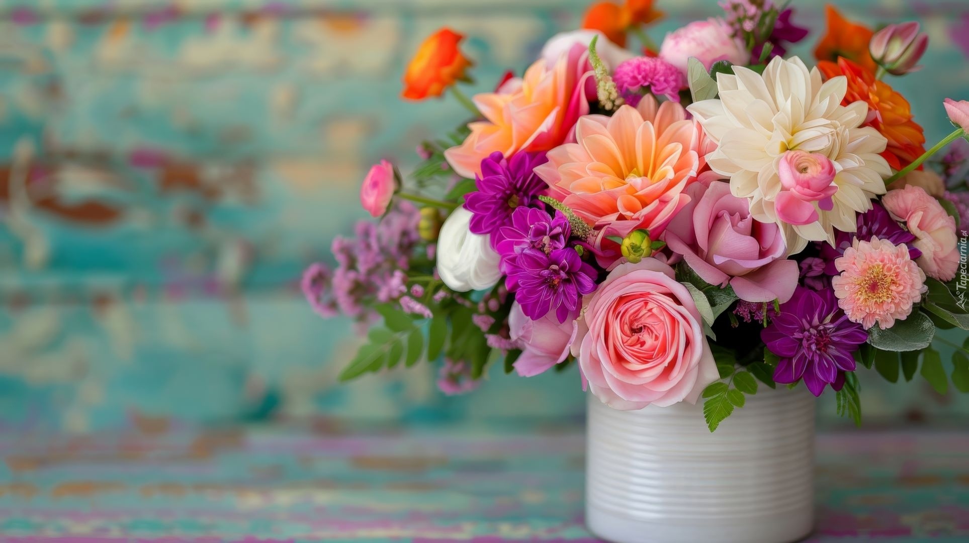 Edytor tapety: Bukiet kolorowych kwiatów w białym wazonie
