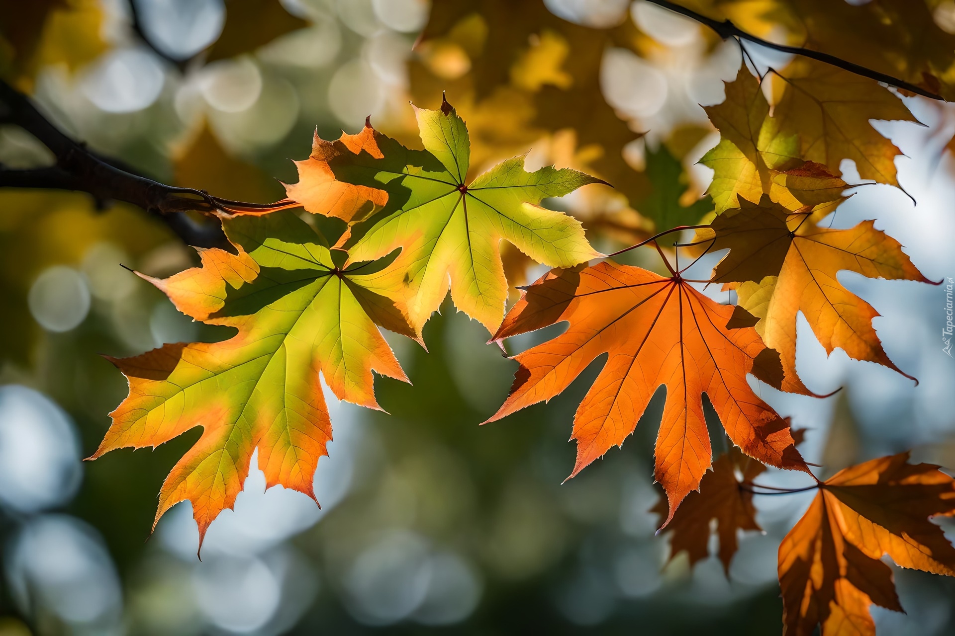 Edytor tapety: Rozświetlone jesienne liście na gałęzi