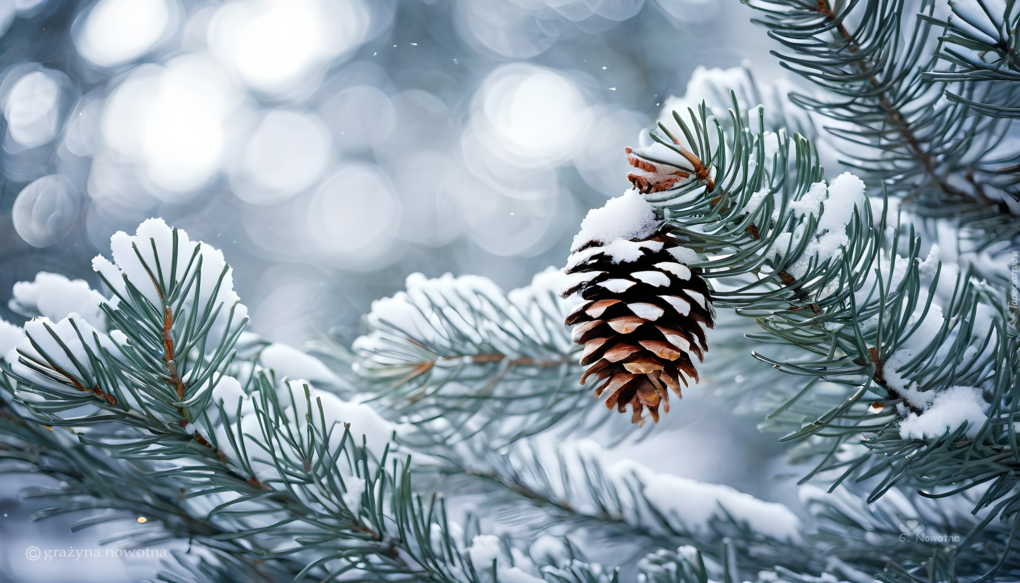 Edytor tapety: Szyszka na ośnieżonej gałązce sosny