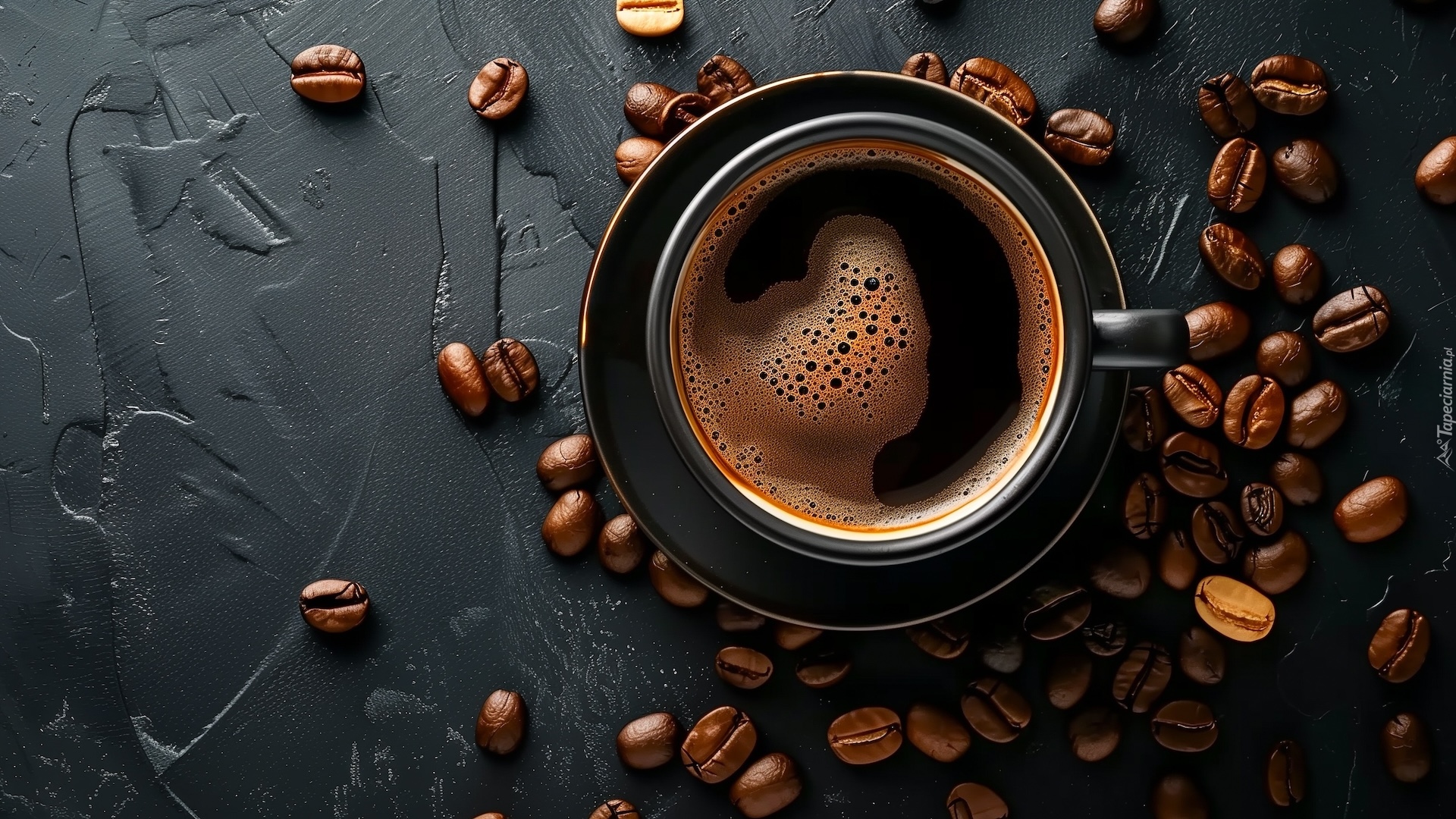 Edytor tapety: Filiżanka z kawą i ziarna obok w grafice