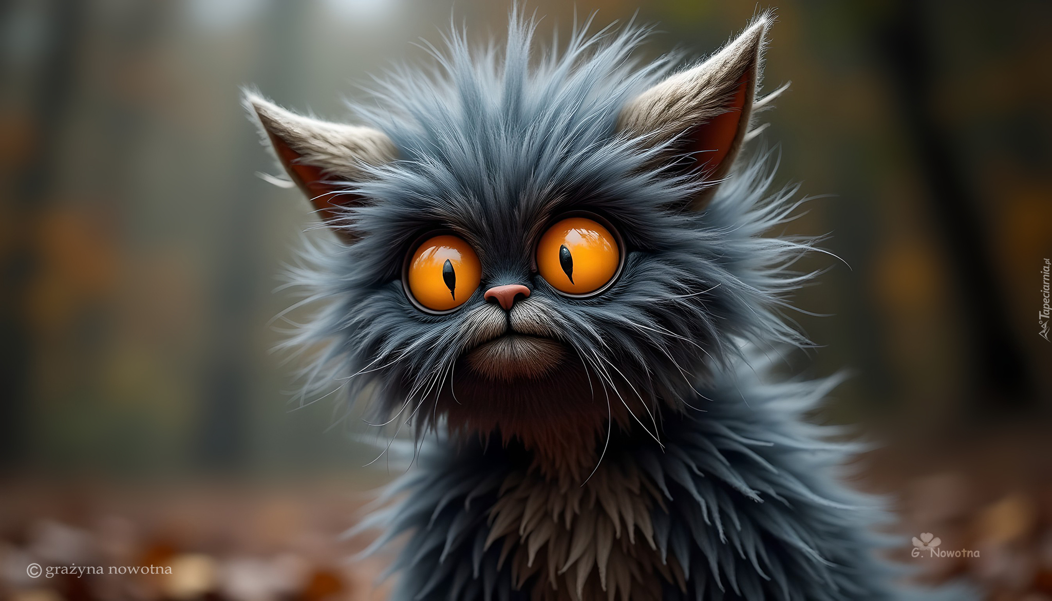 Edytor tapety: Włochaty czarny stworek z wielkimi pomarańczowymi oczami