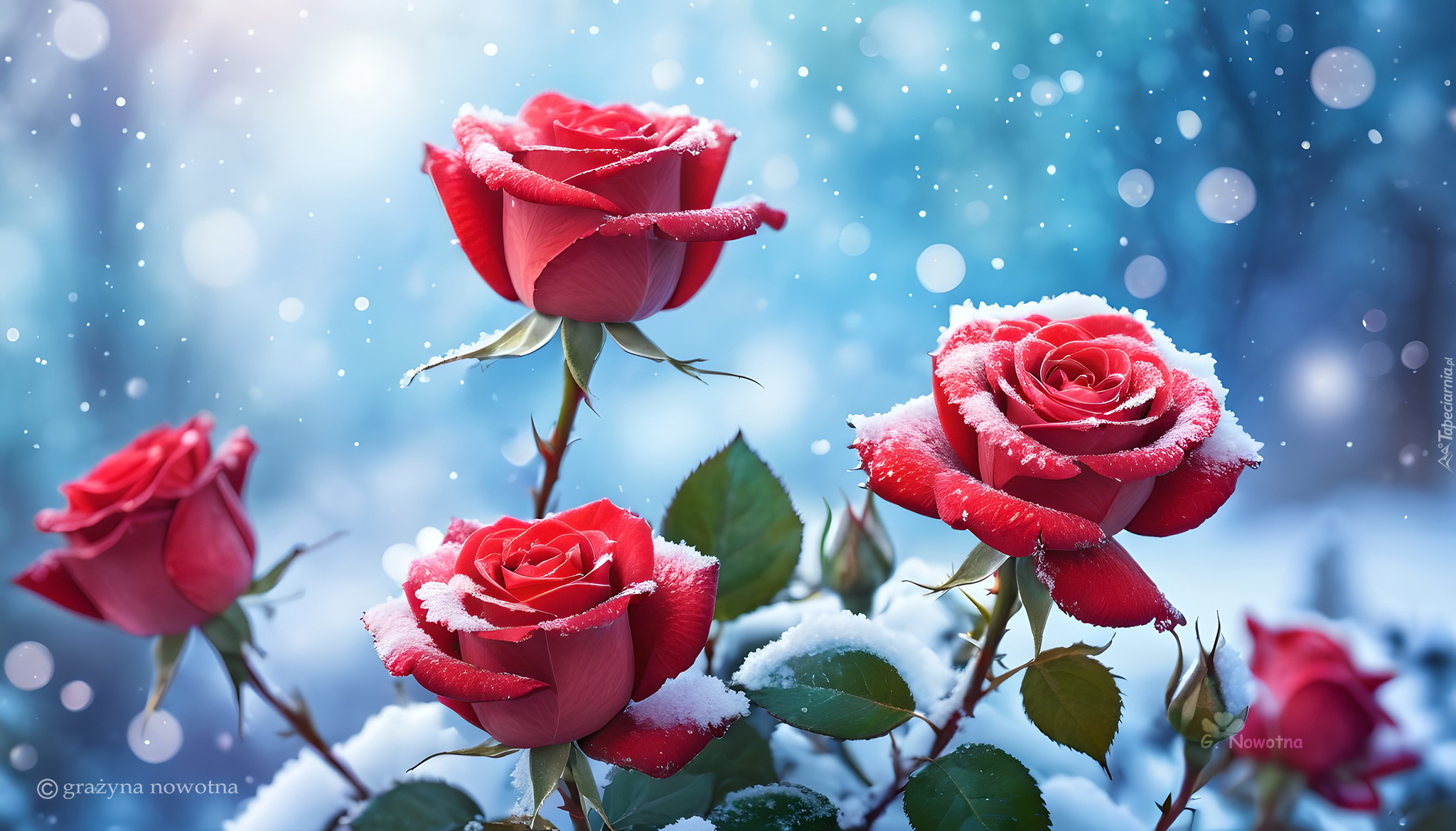 Edytor tapety: Ośnieżone czerwone róże w grafice