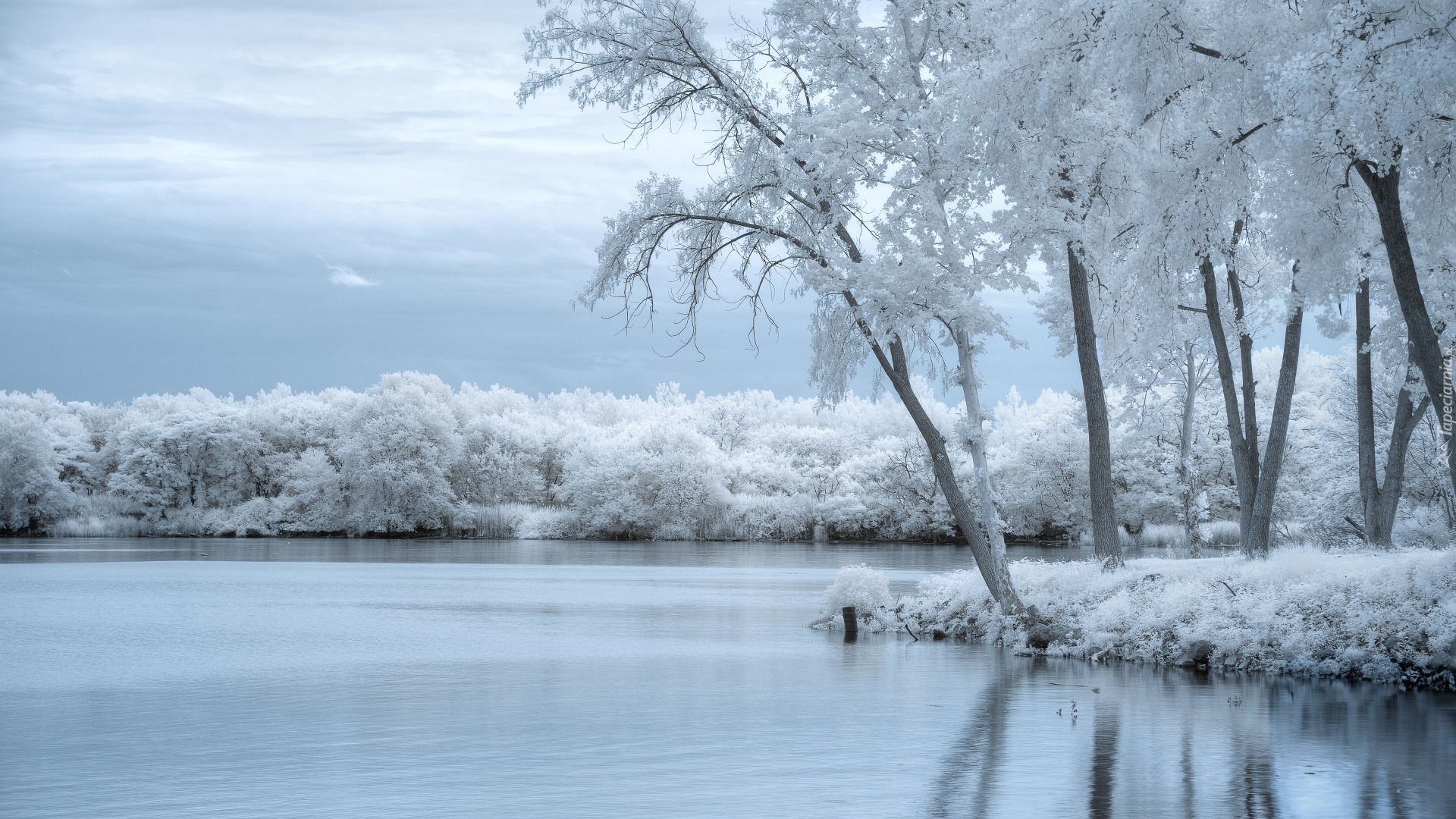 Edytor tapety: Pochmurne niebo nad oszronionymi drzewami nad jeziorem