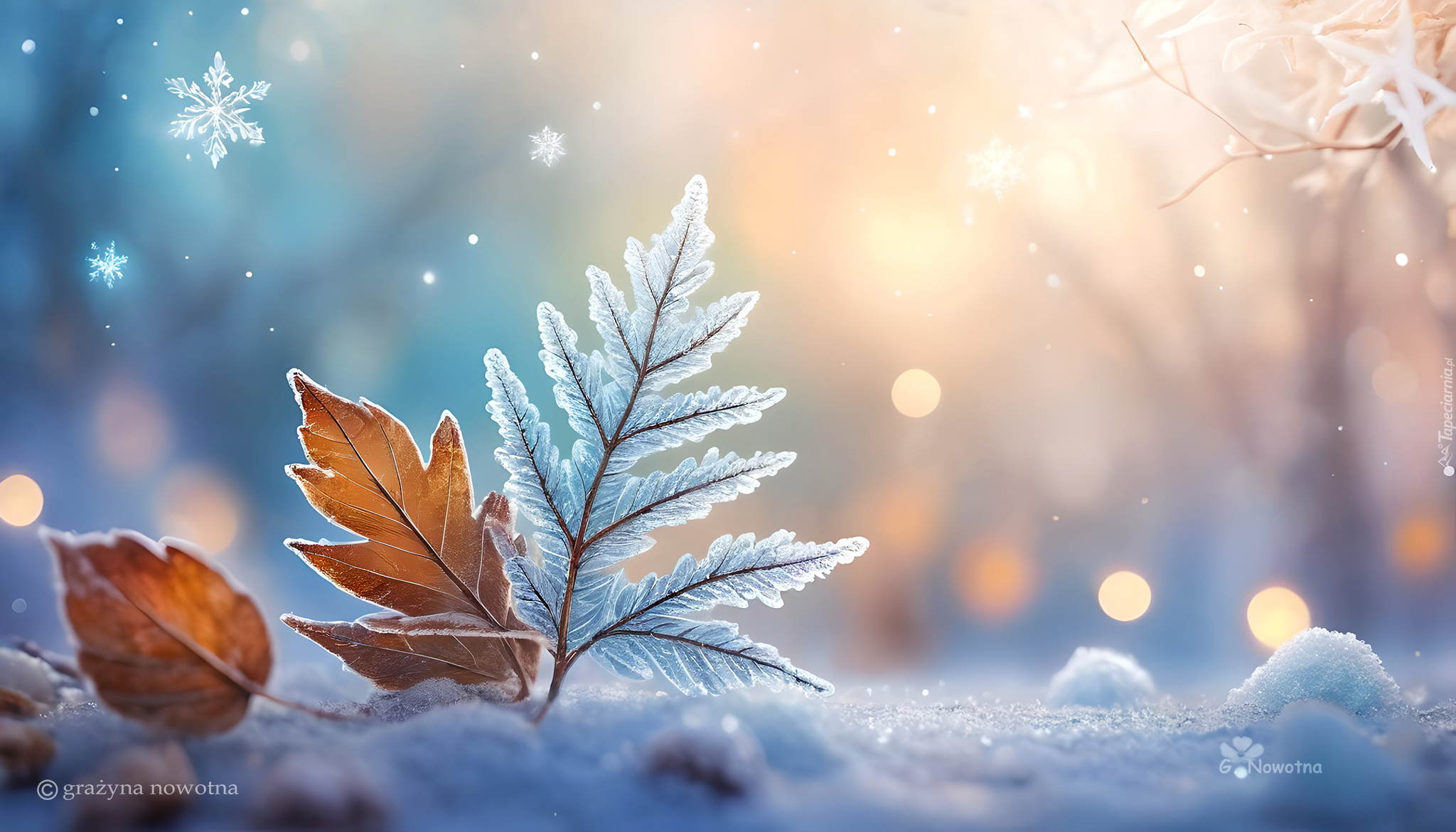 Edytor tapety: Oszronione liście i śnieżynki w blasku światła