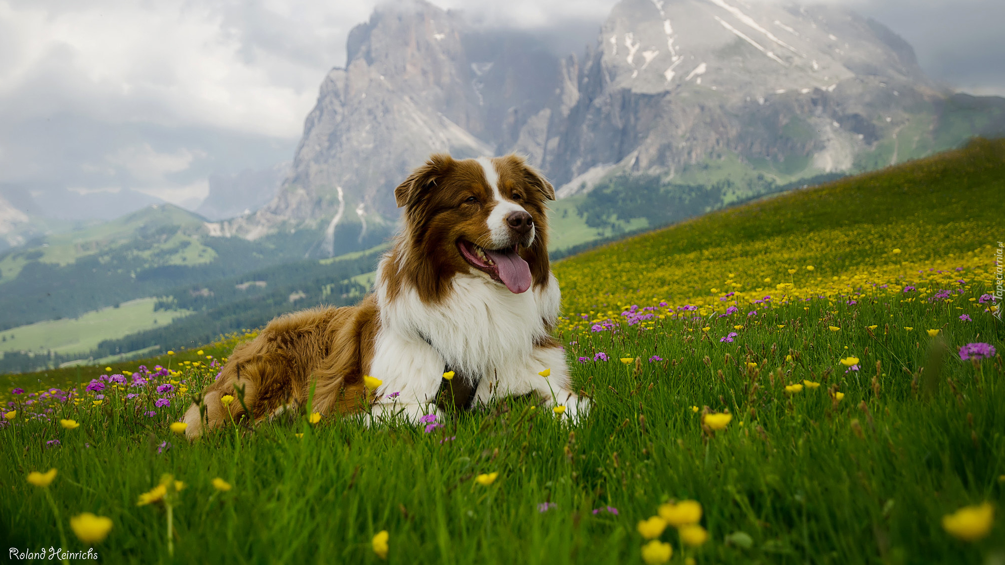 Edytor tapety: Leżący owczarek australijski na ukwieconej górskiej łące