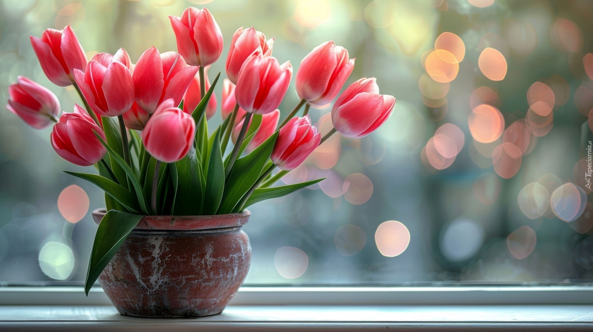 Edytor tapety: Różowe tulipany w wazonie na parapecie okiennym