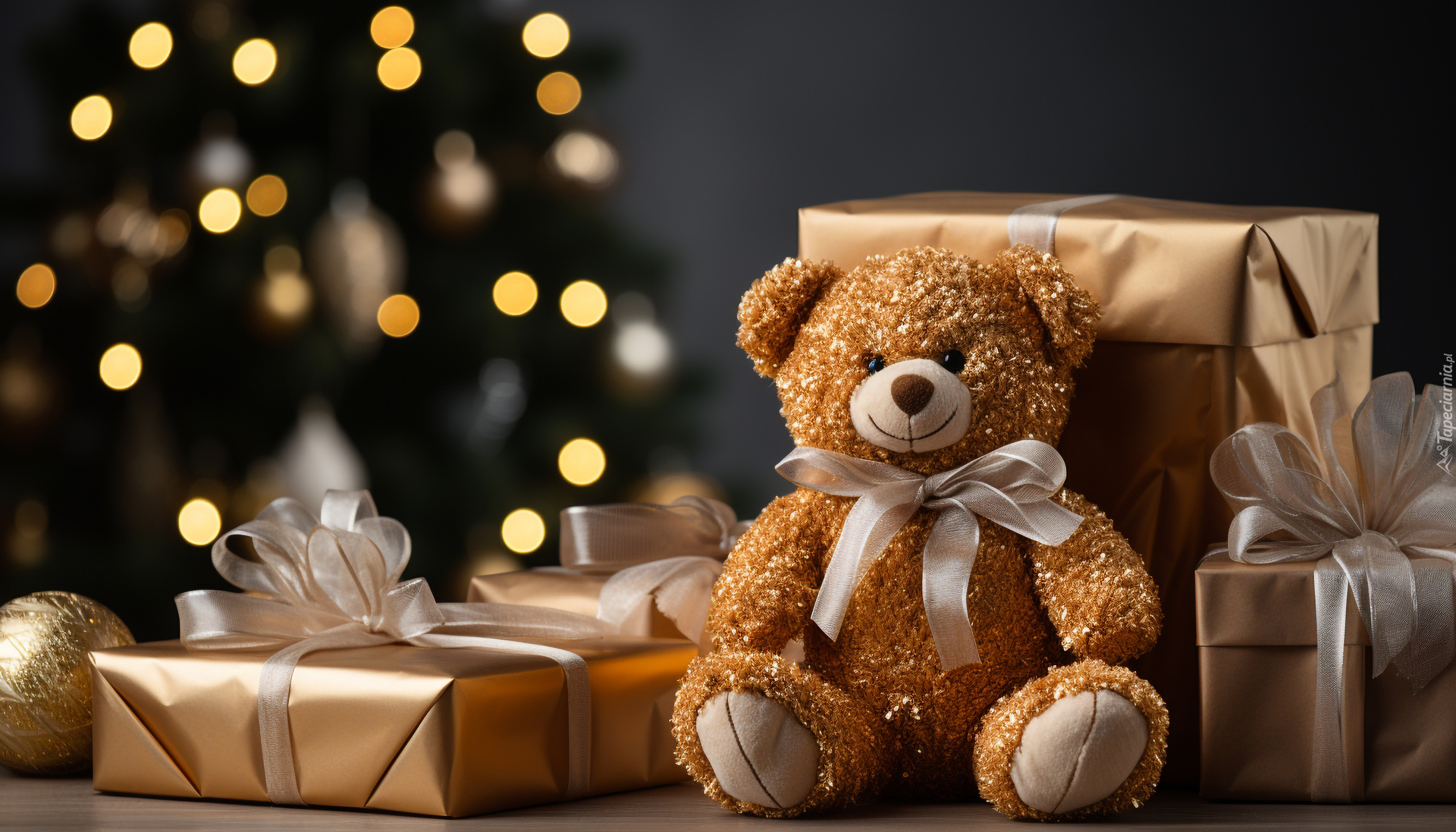 Edytor tapety: Pluszowy miś z kokardą na szyi i prezenty
