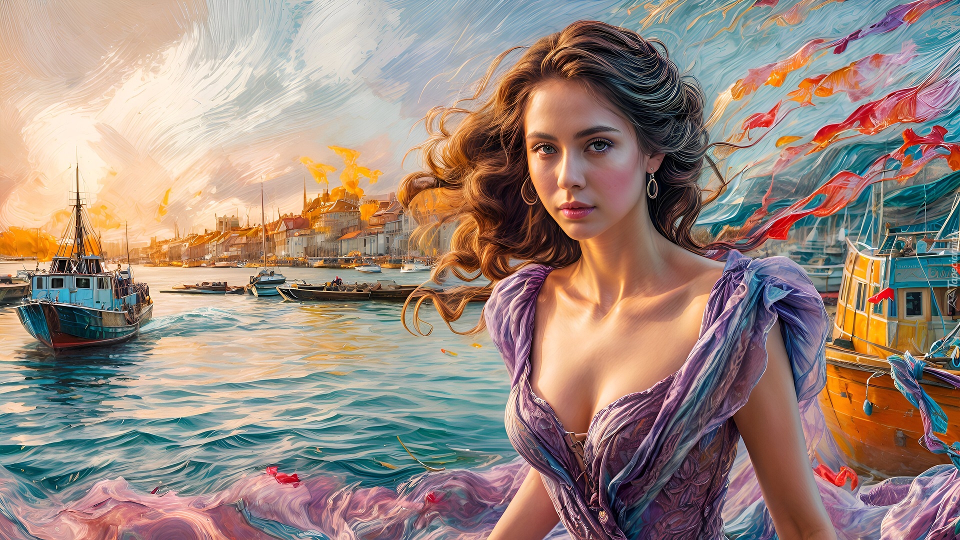 Edytor tapety: Kobieta i kutry na tle domów w miasteczku
