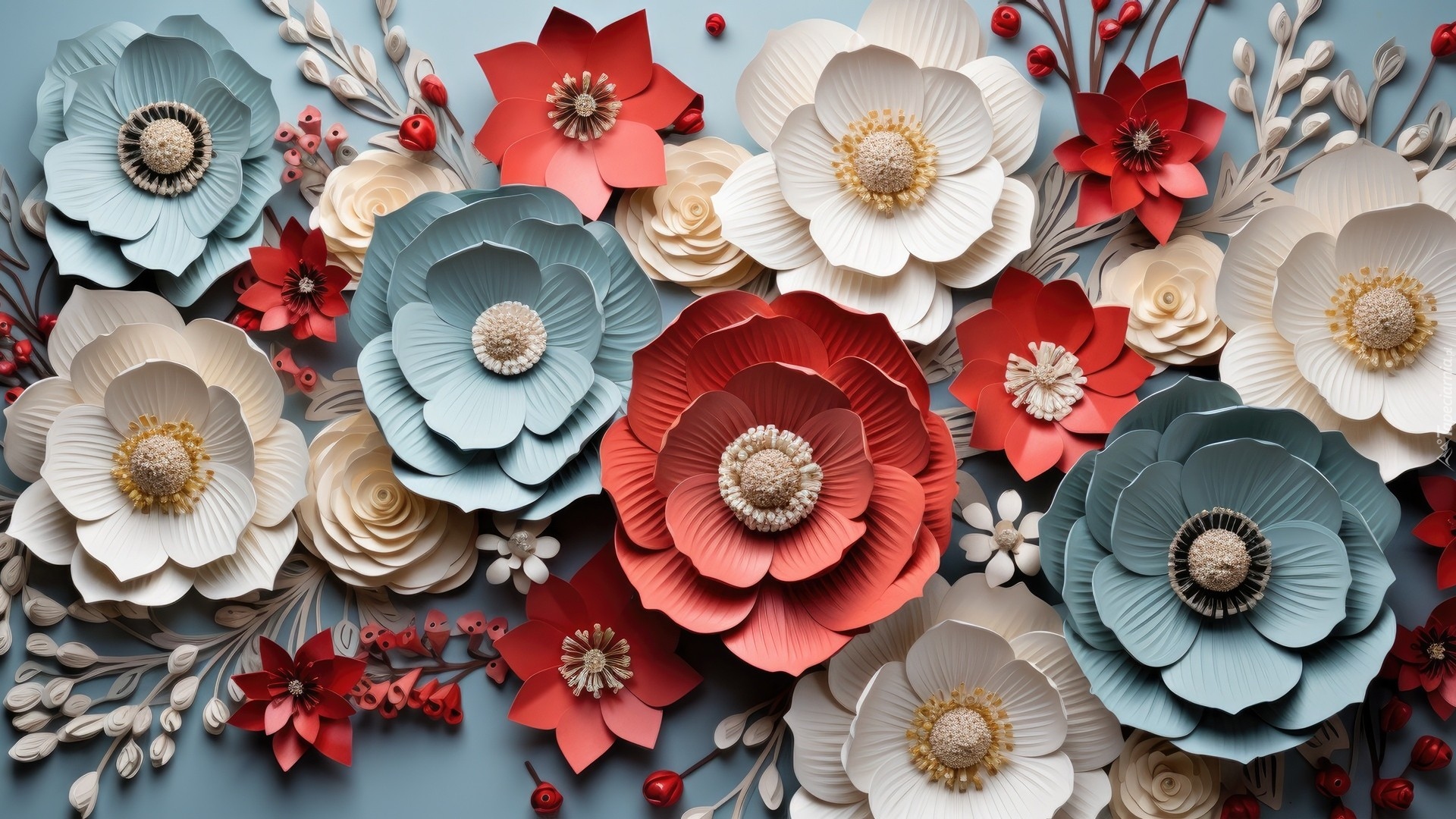 Edytor tapety: Papierowe kolorowe kwiaty na szarym tle