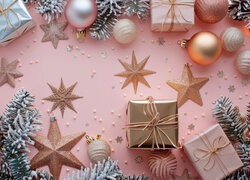 Edytor tapety: Kompozycja z bombkami i gwiazdkami na różowym tle