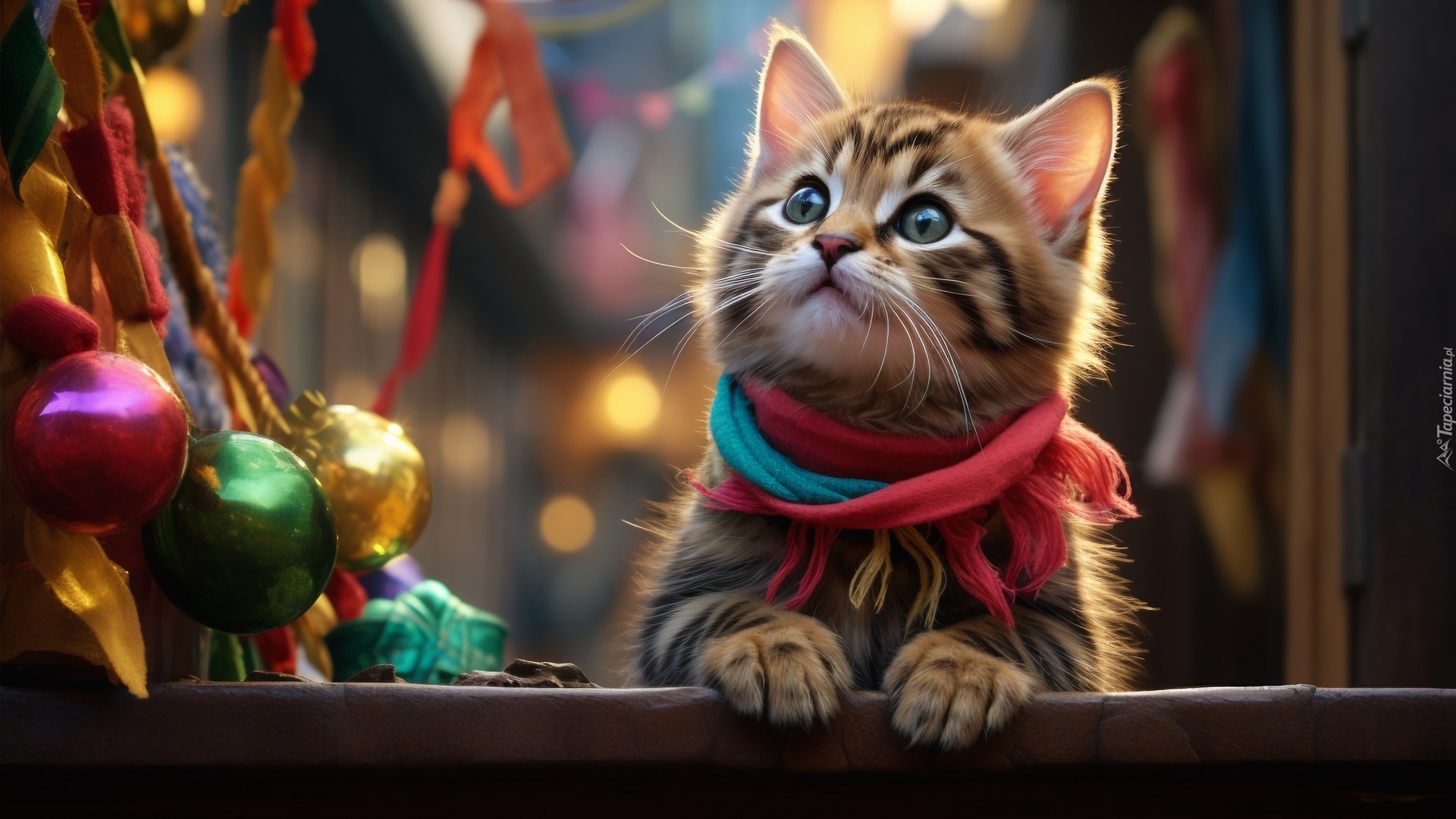 Edytor tapety: Mały kotek z różowym szalikiem obok kolorowych bombek