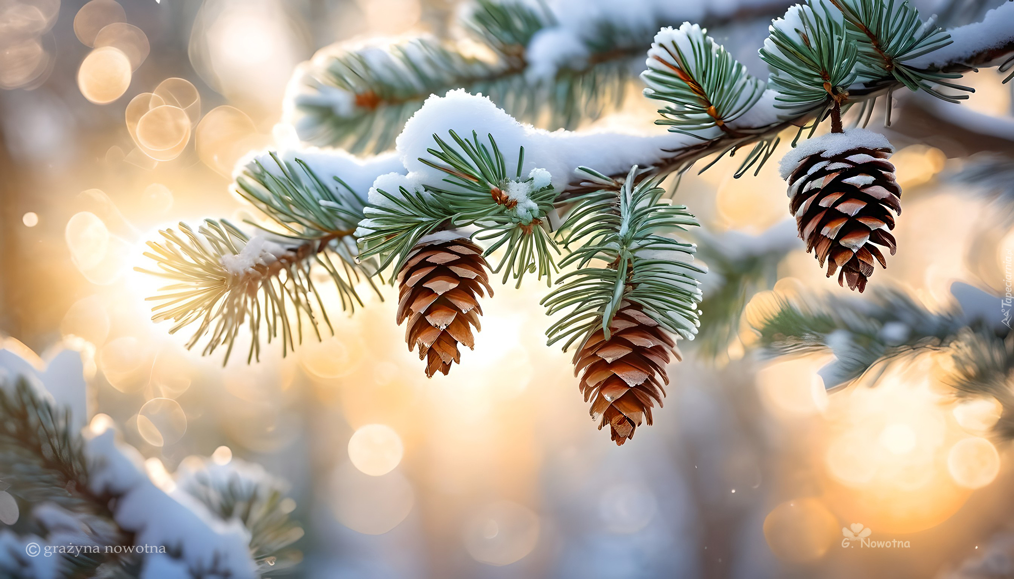 Edytor tapety: Trzy szyszki na ośnieżonej gałązce