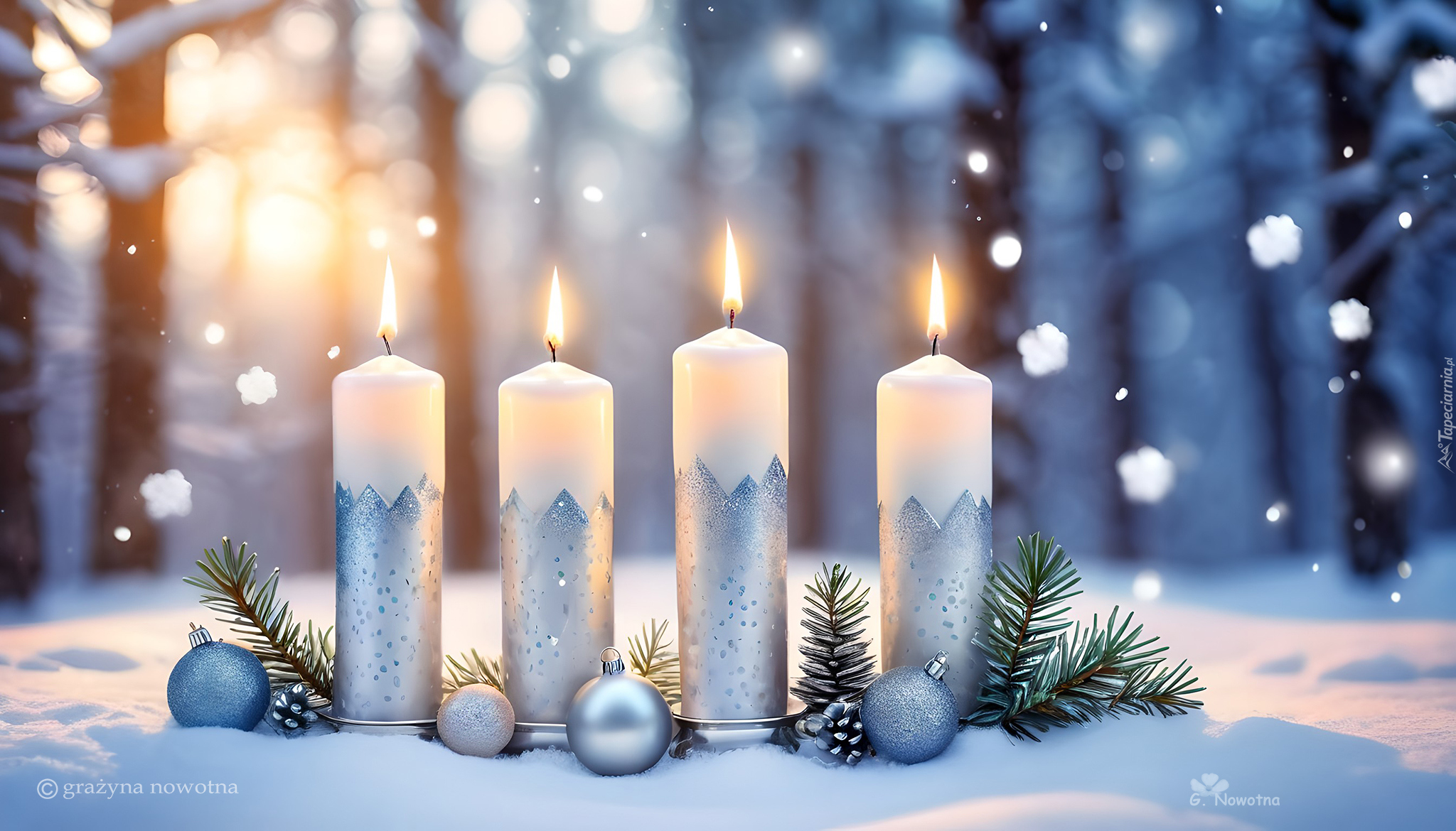 Edytor tapety: Skromny stroik z czterema zapalonymi świecami