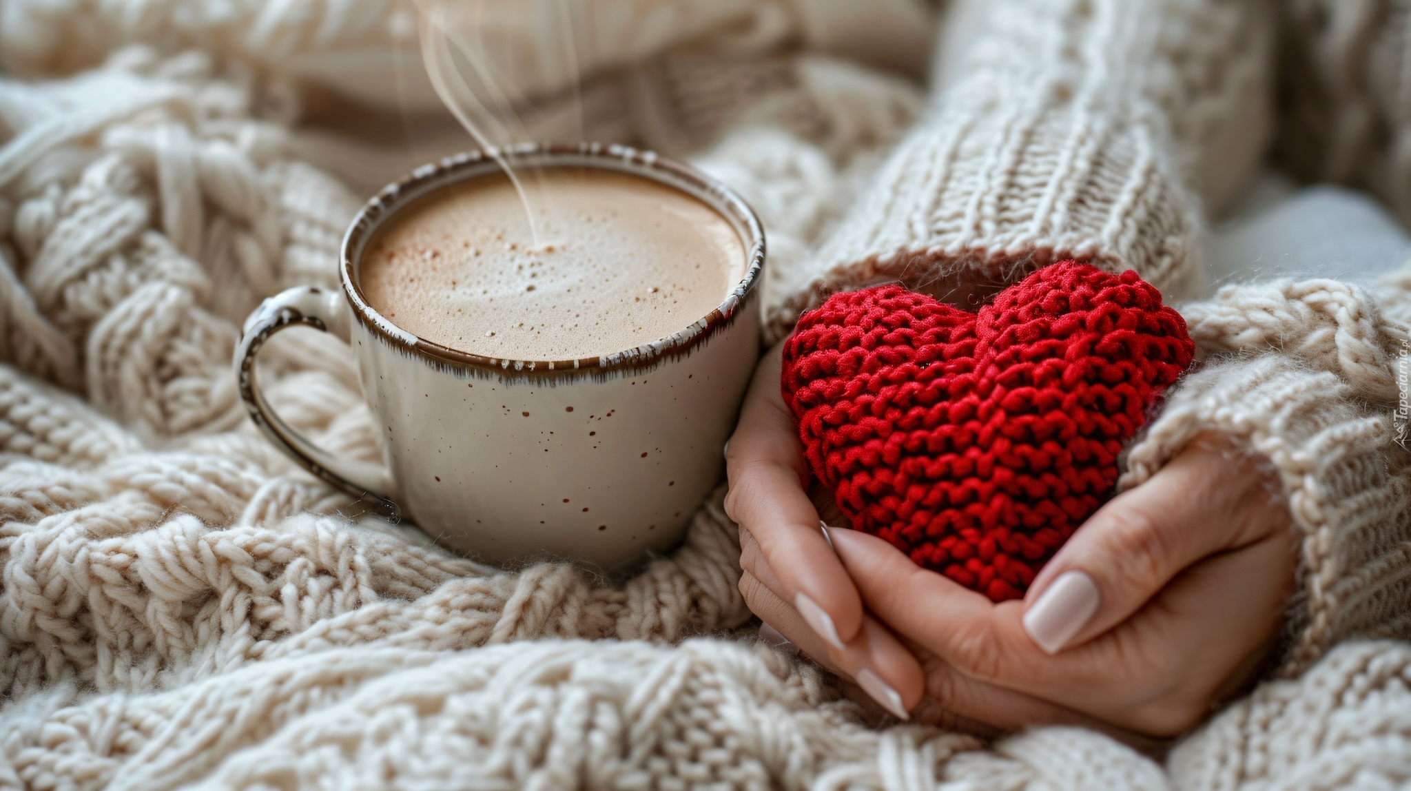 Edytor tapety: Kubek z kawą obok czerwonego serca w dłoniach