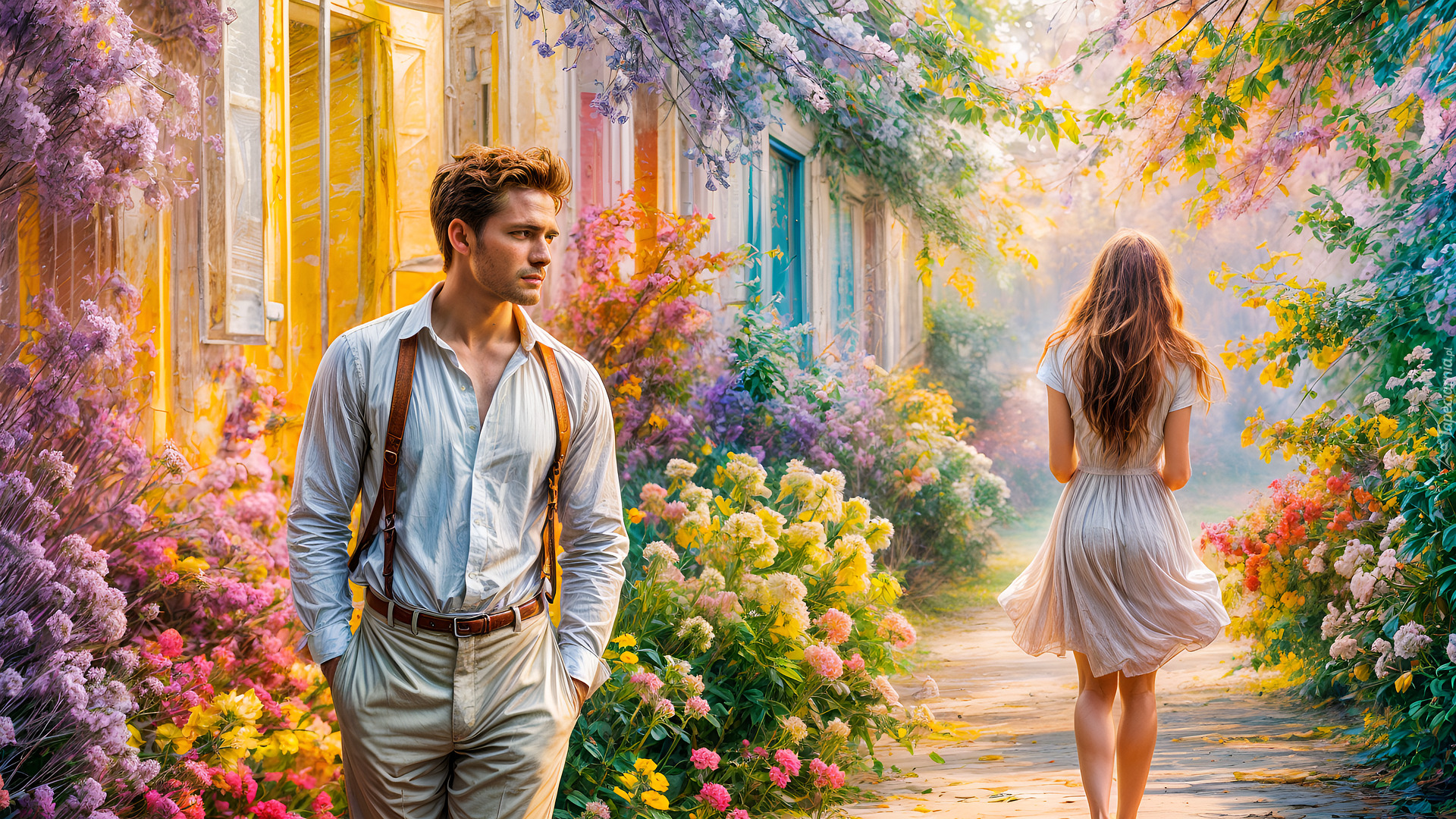 Edytor tapety: Kobieta i mężczyzna idący ścieżką w ogrodzie