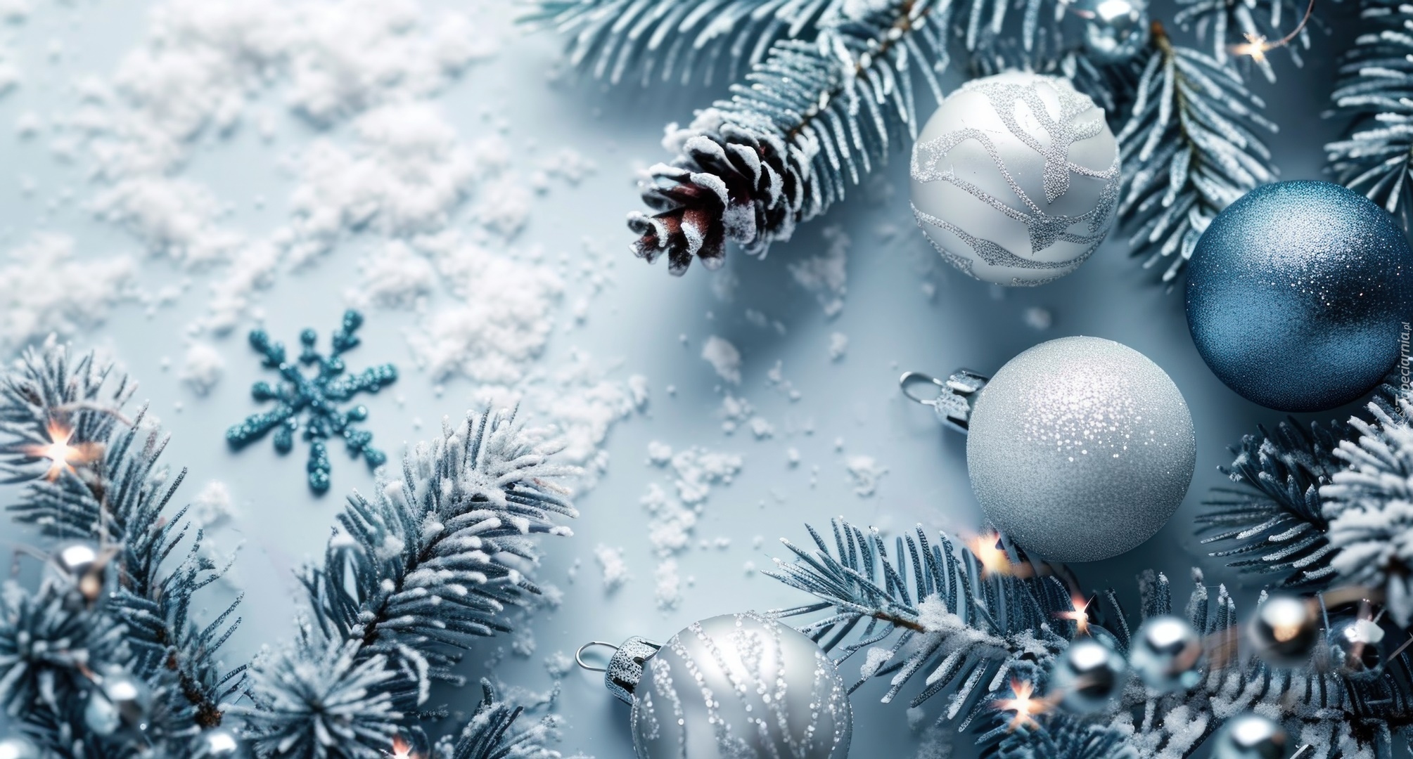 Edytor tapety: Bombki i światełka na ośnieżonych świerkowych gałązkach