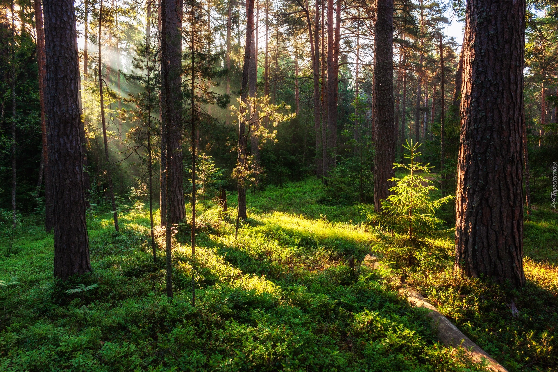 Edytor tapety: Przebijające światło pomiędzy drzewami w lesie