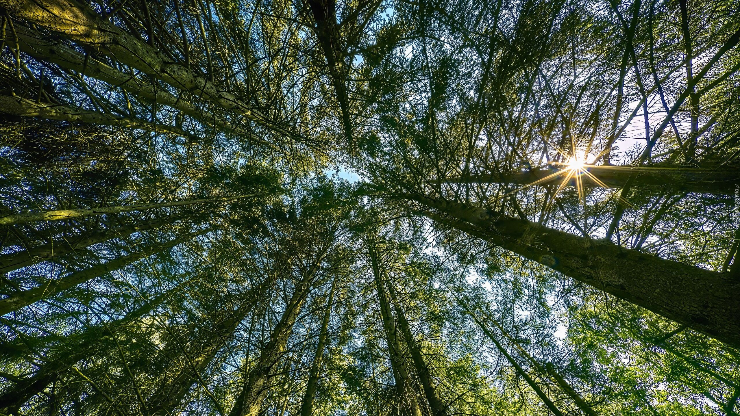 Edytor tapety: Promienie słońca wśród wierzchołków drzew