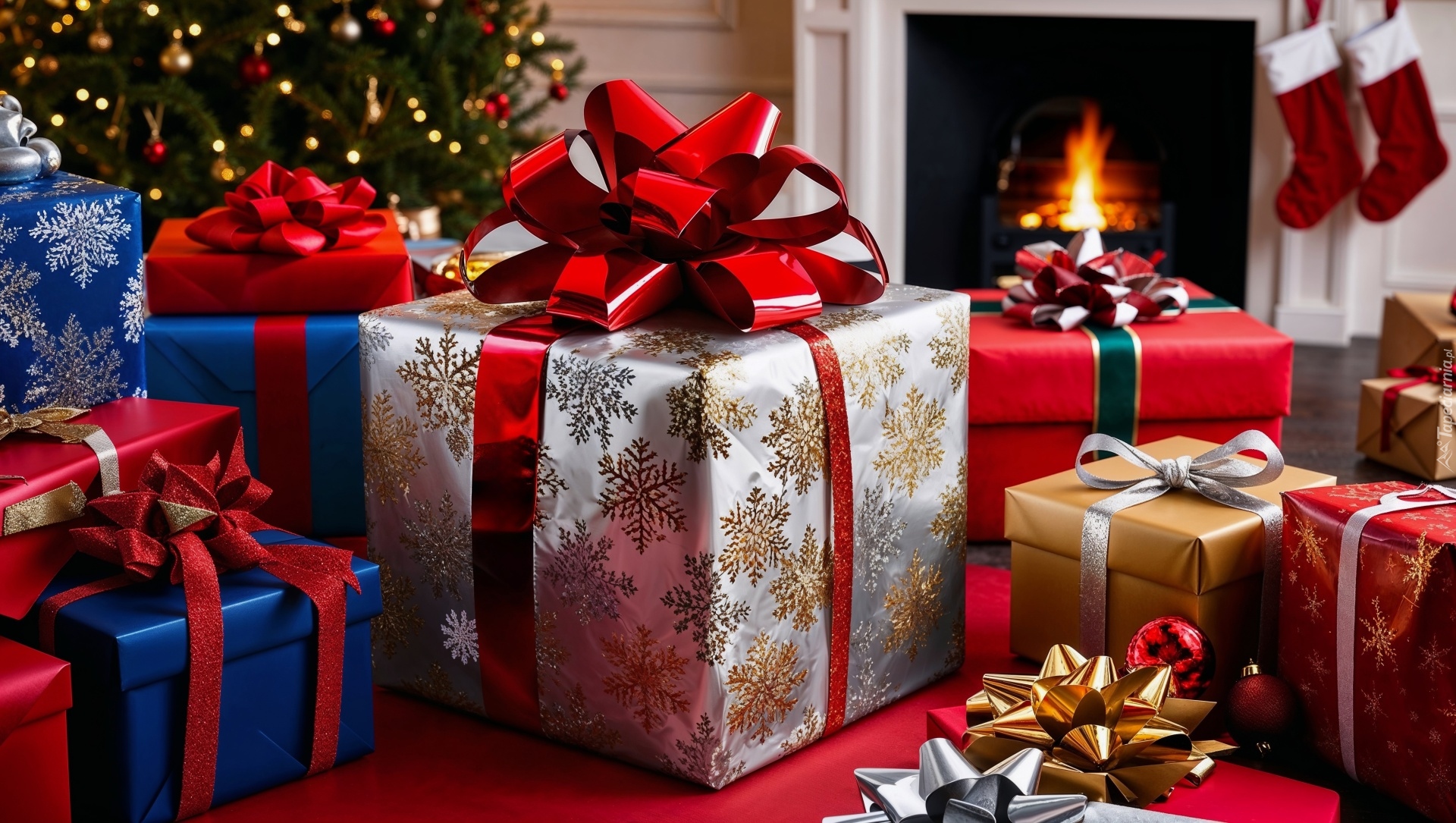 Edytor tapety: Kolorowe prezenty z kokardami obok kominka