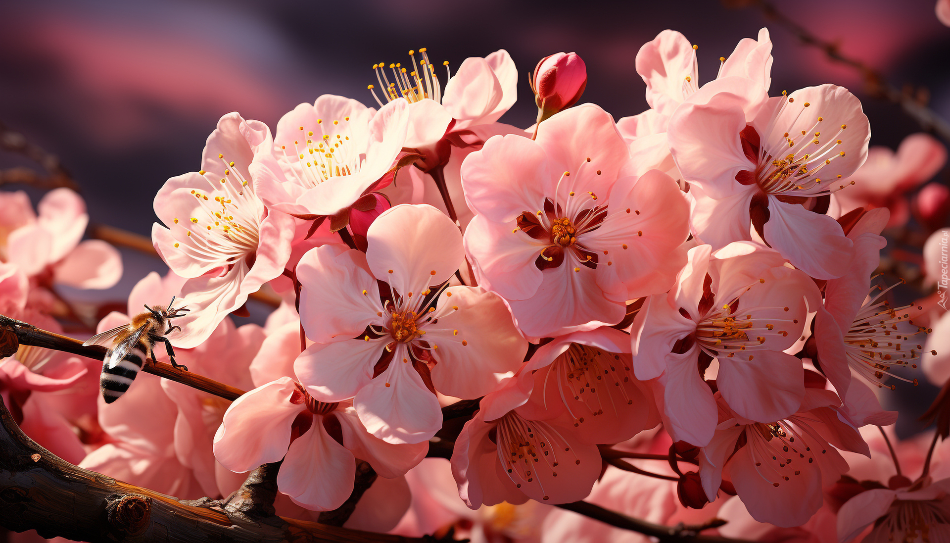 Edytor tapety: Pszczoła na różowych kwiatach drzewa owocowego