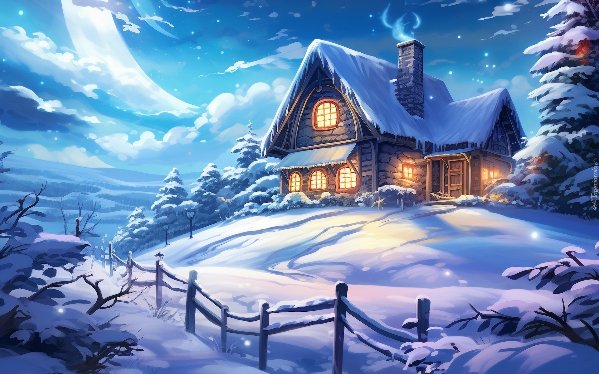 Edytor tapety: Oświetlony dom na wzgórzu w zimowej scenerii