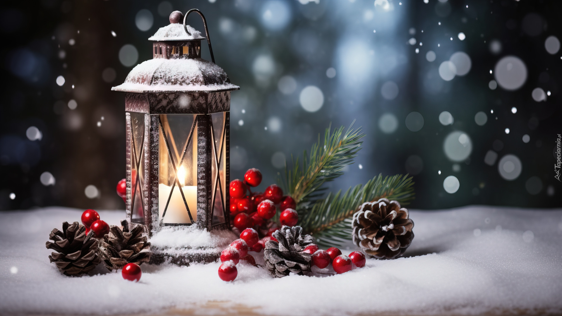 Edytor tapety: Ośnieżony lampion i szyszki na śniegu