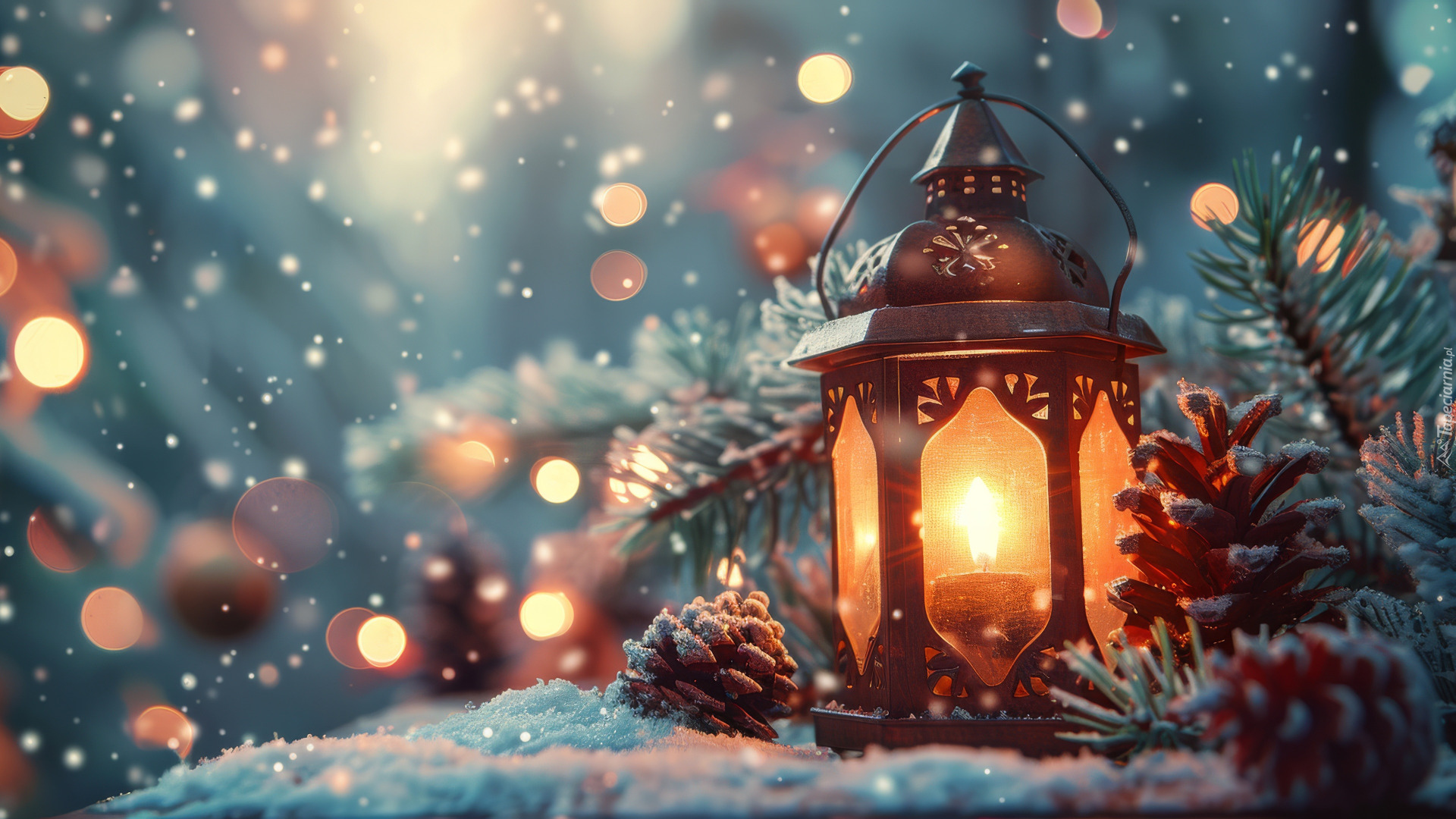 Edytor tapety: Zapalony lampion szyszki i gałązki w padającym śniegu